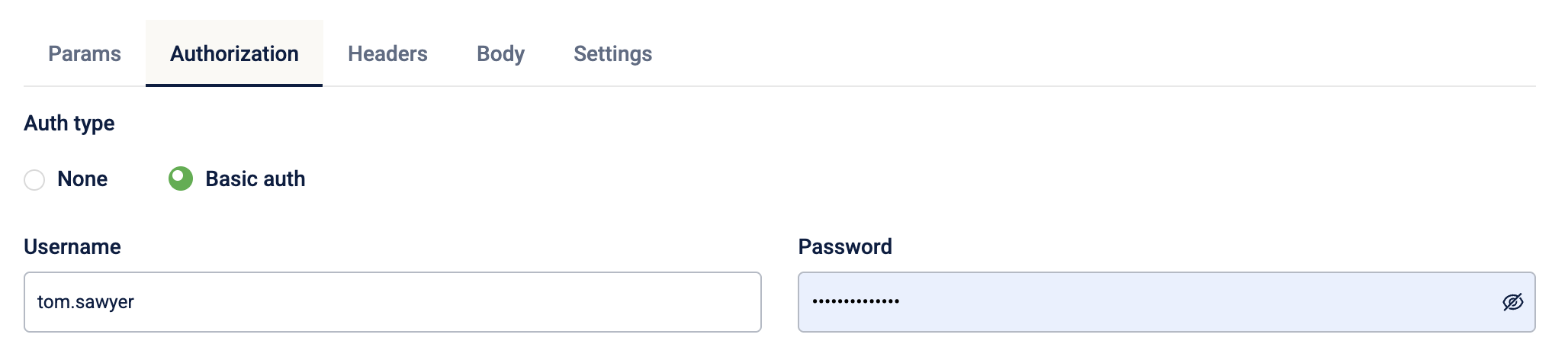The Authorization tab allows you to specify the credentials the webhook will use. The correct method depends on the requirements of the third-party service. The following types are supported: