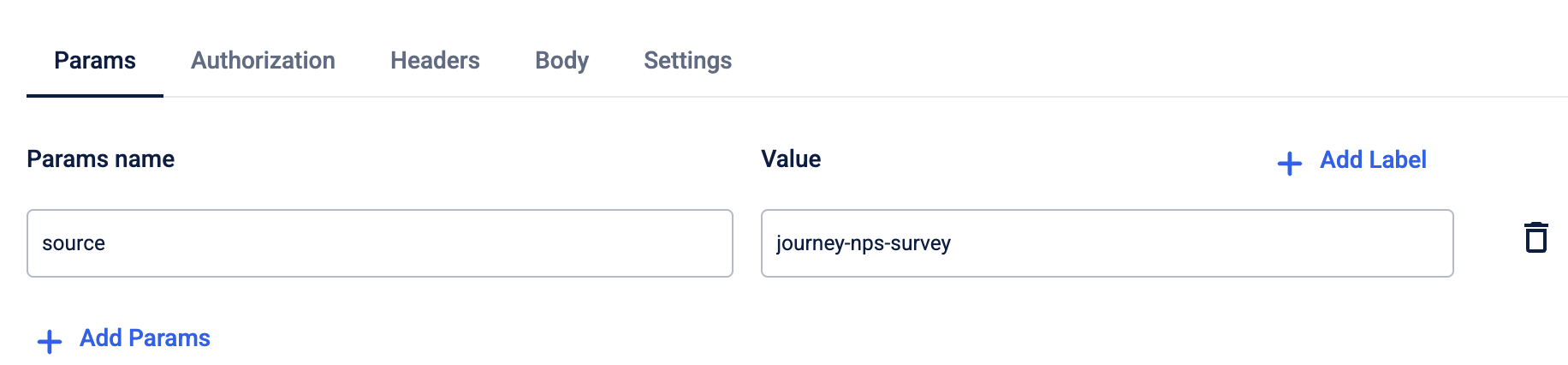 On the Params tab, enter the query parameters. You can add up to 10 parameters. You can add a label, such as "Customer Email", as a variable value.