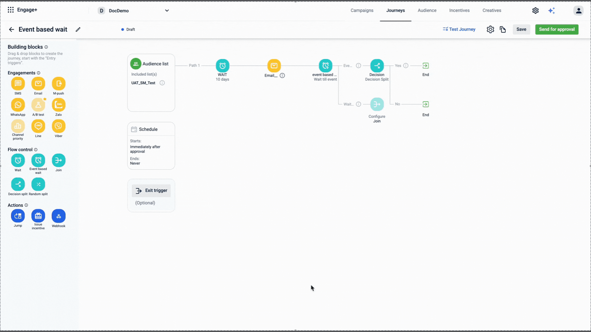 NoteThe webhook block cannot be edited once the journey has been sent for approval. Test webhooks thoroughly before going live as edits require re-approval.