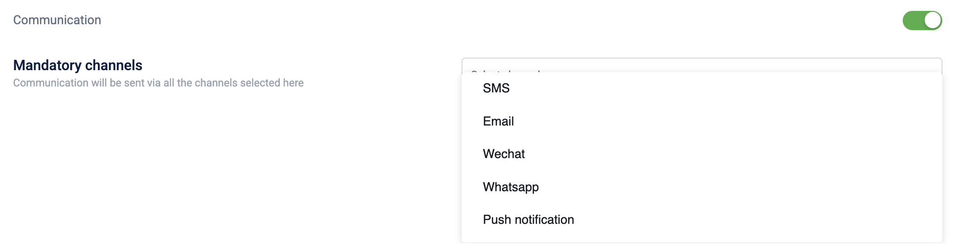 Mandatory channels: From here, you can choose the communication channels that will invariably be used and through which the communication will definitely be sent out.