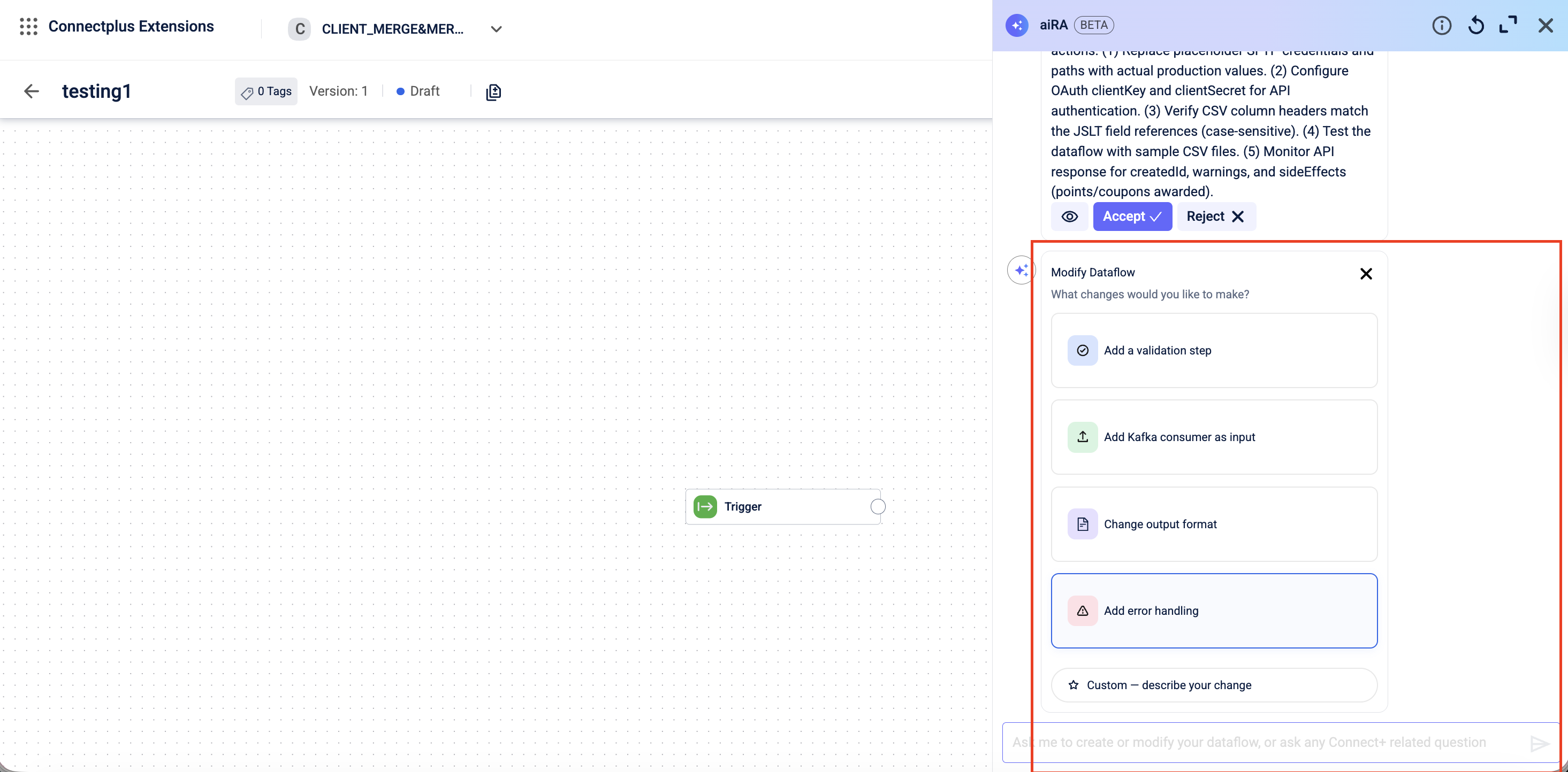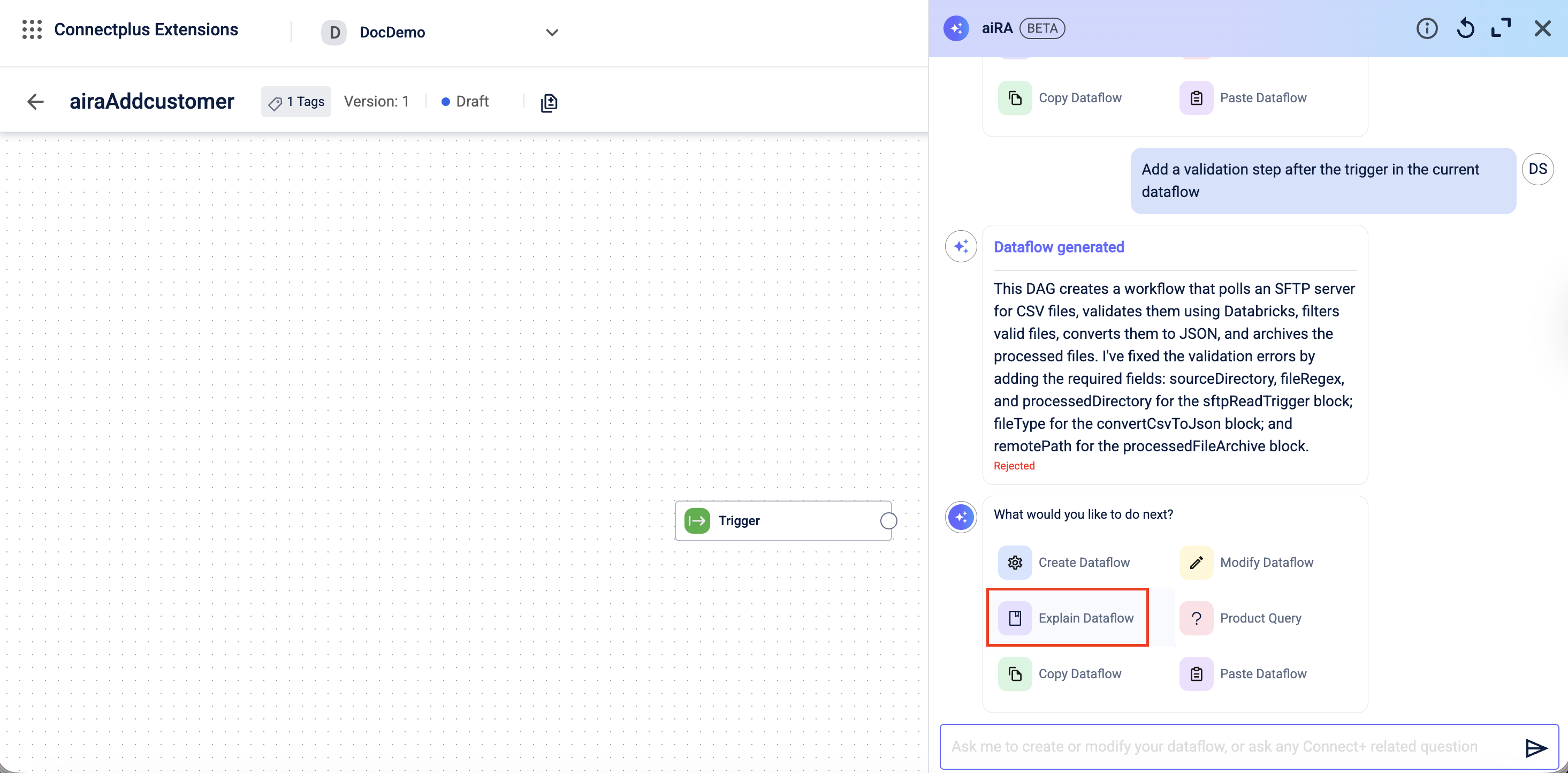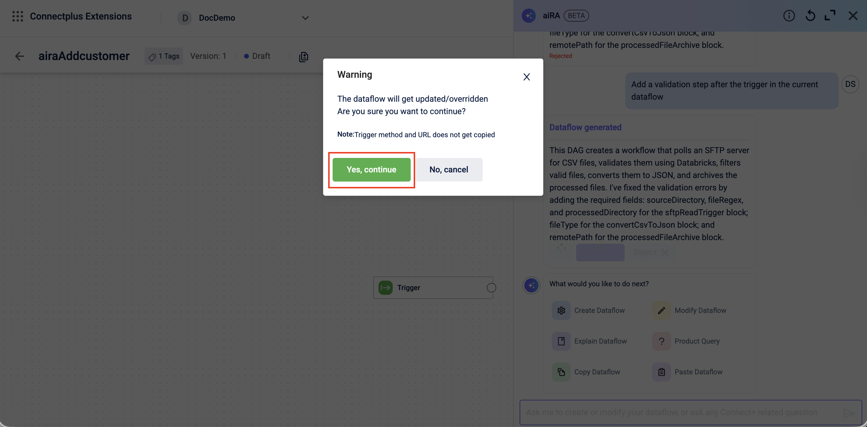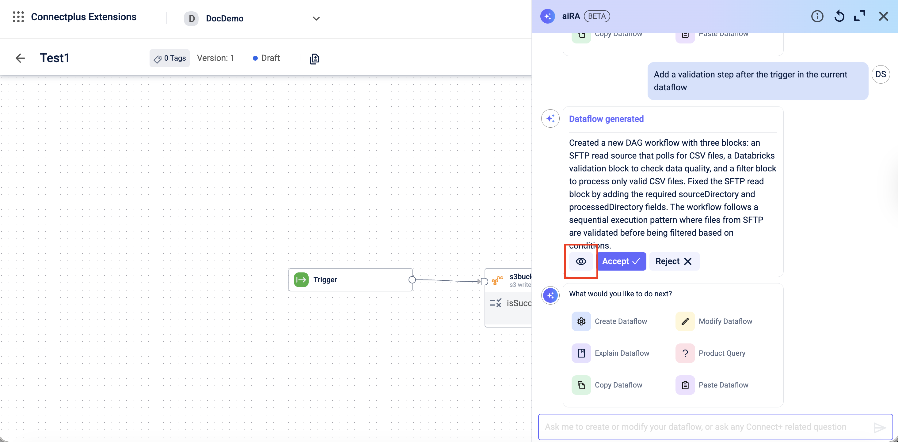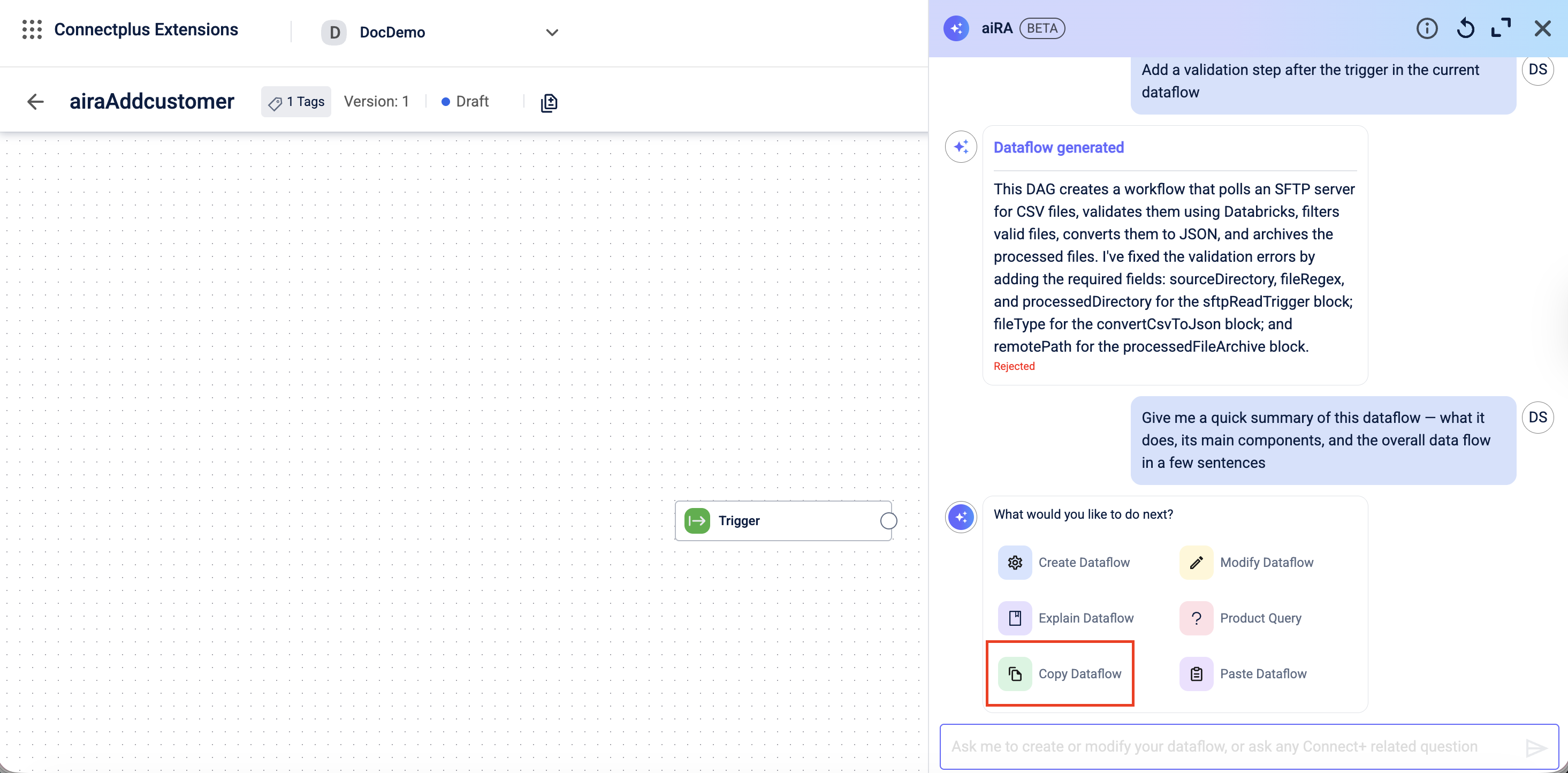 You can use aiRA Coder to update an existing dataflow in Draft state. Instead of editing block configurations manually, you describe the change you want, and aiRA Coder applies it.