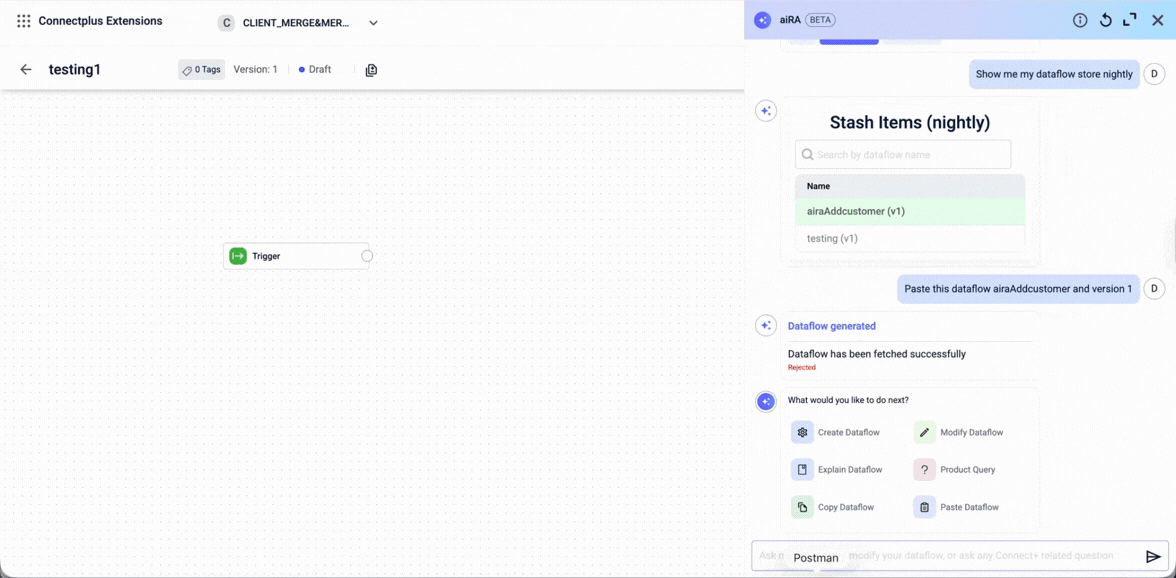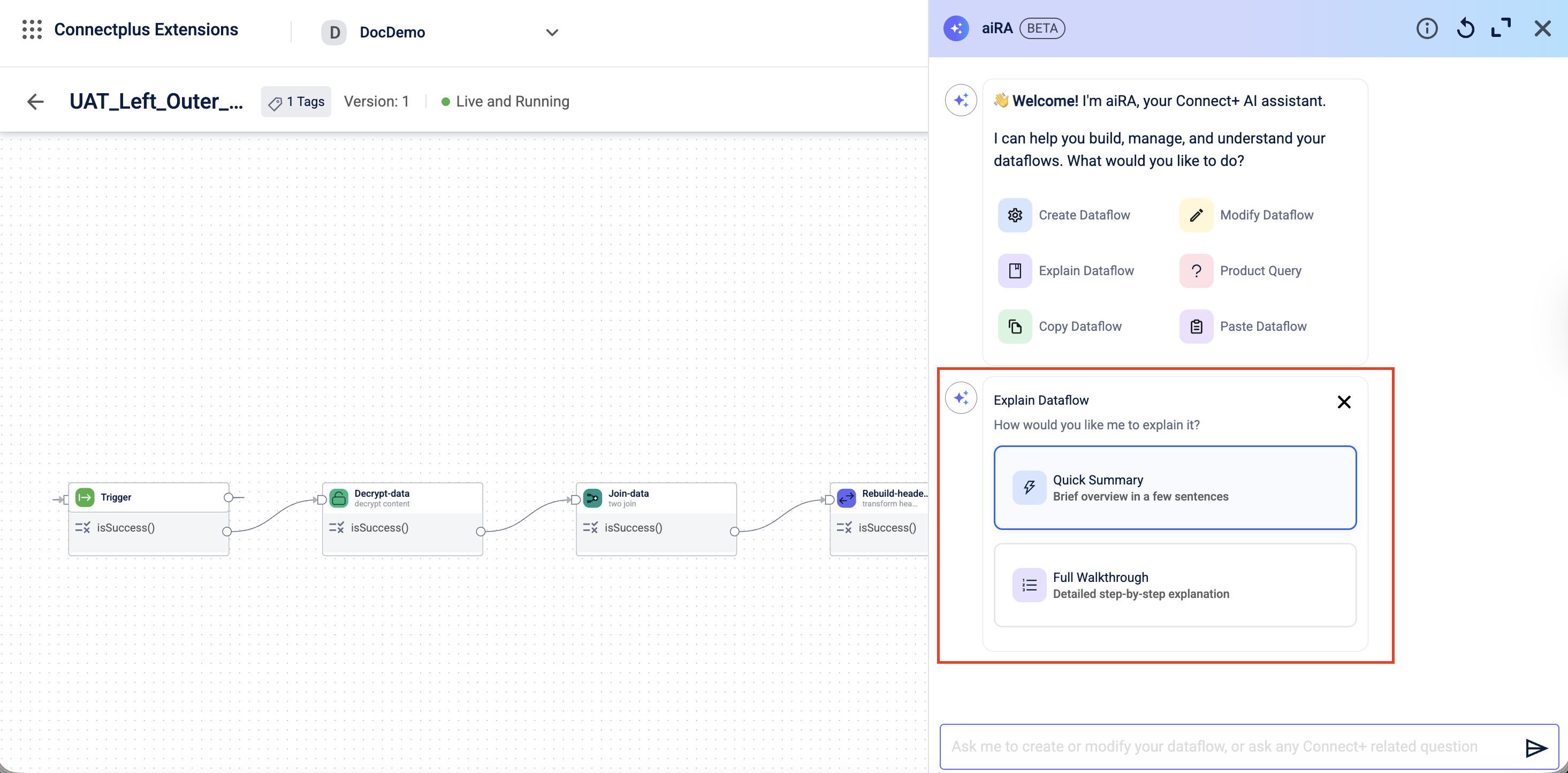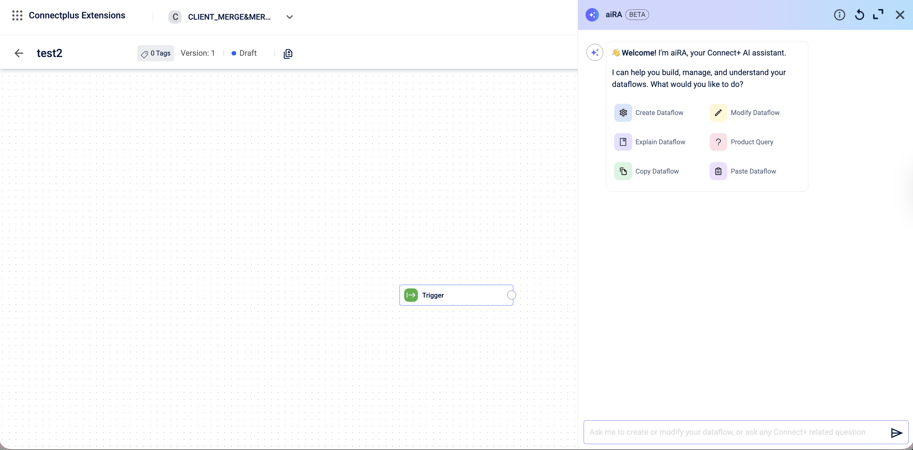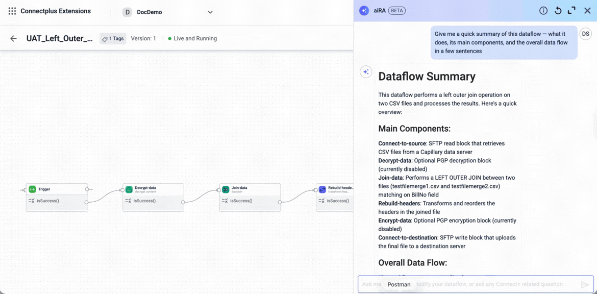 Connect+ includes a built-in AI assistant called aiRA Coder. It is integrated directly into the dataflow canvas and lets you build, understand, and manage dataflows through plain-language conversation. Instead of assembling every block manually or writing transformation scripts from scratch, you describe what you want and aiRA Coder generates the result.