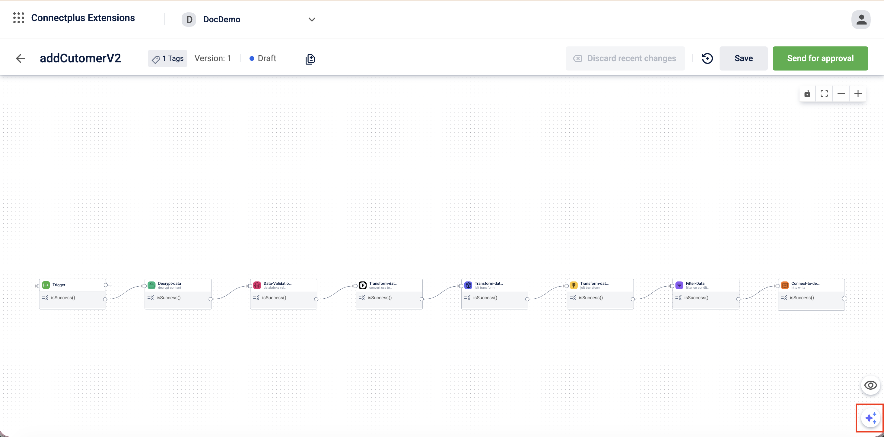 Dataflow generation: Based on the interpreted intent, the system generates a draft configuration. This includes the required blocks, connections, and any transformation scripts.