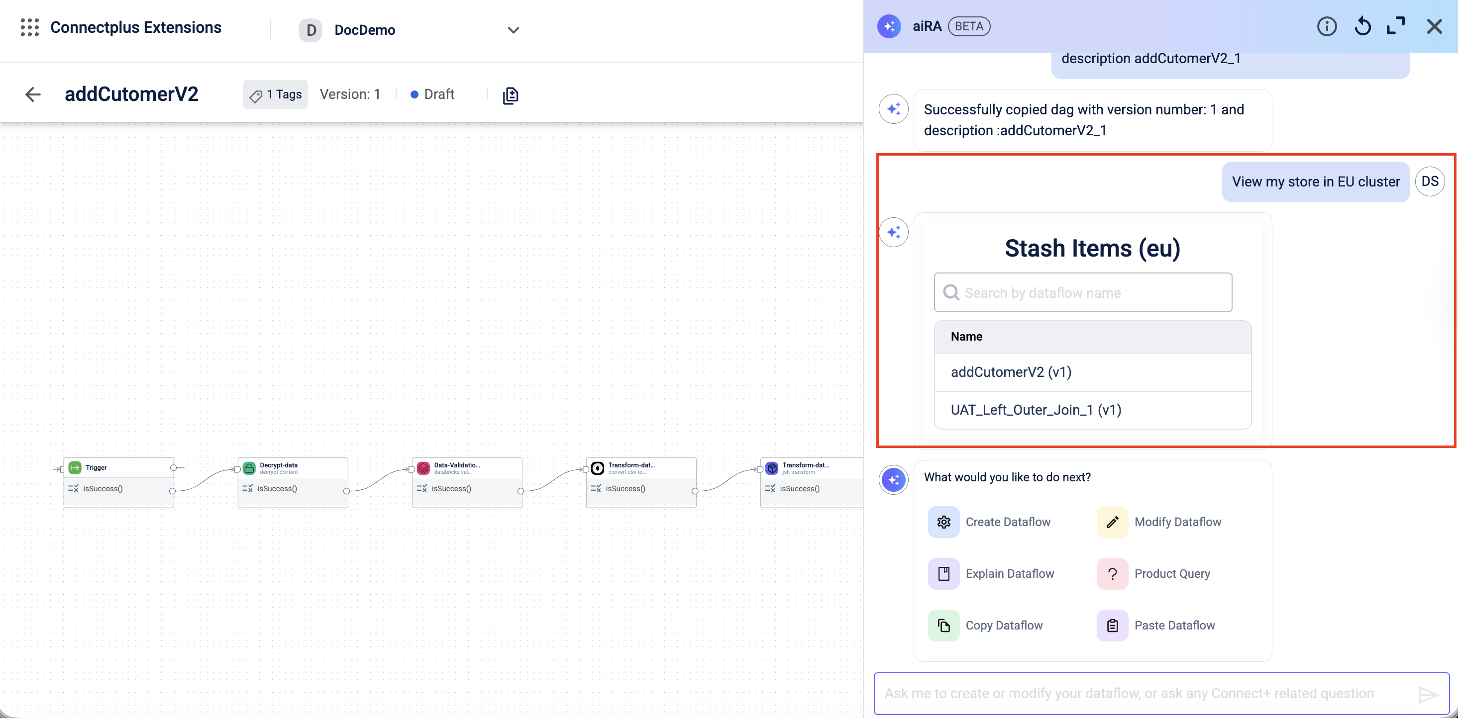 AIRA returns a proposed dataflow with a step-by-step explanation and a preview. -