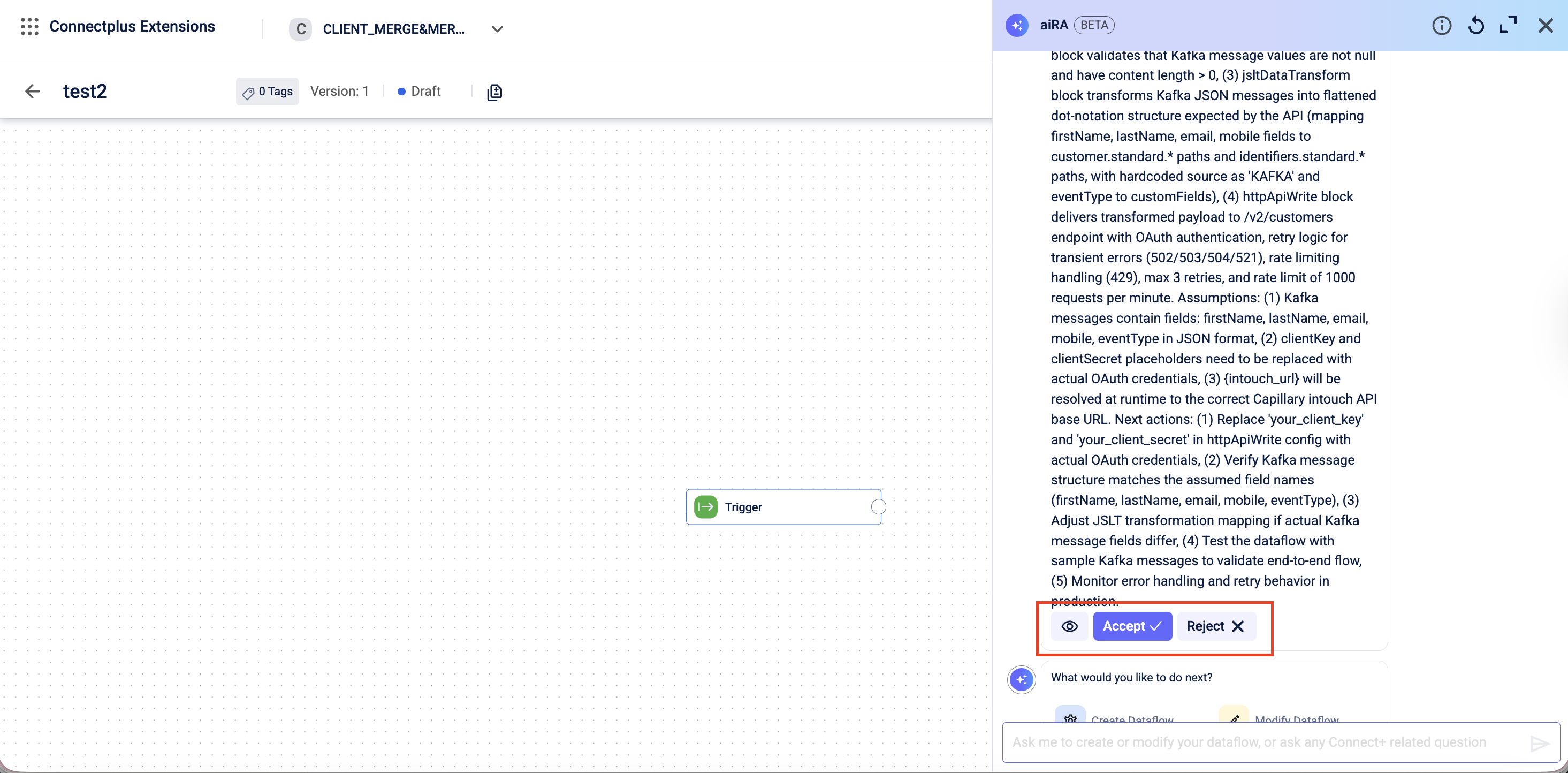 Note: aiRA Coder generates a starting configuration based on your prompt. Review the output and update any field mappings specific to your organization before making the dataflow live.