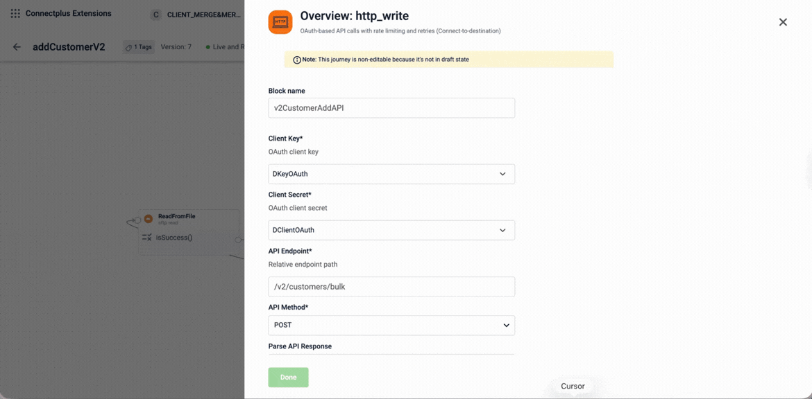 The http_write block sends data to an external HTTP API endpoint using OAuth-based authentication as a destination block in a Connect+ dataflow. It supports rate limiting, configurable retry logic, and response parsing. The block is typically used to post process data to Capillary or third-party APIs.