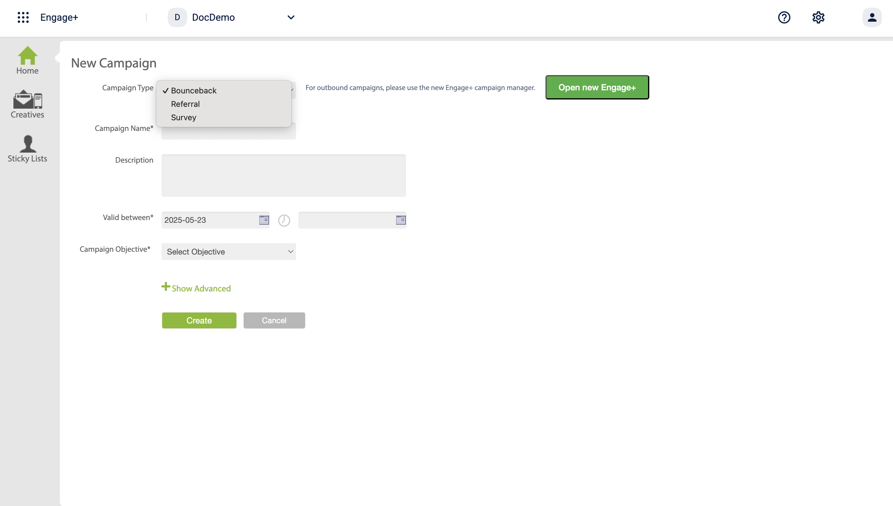 ImportantBounceback or DVS campaign can be created from the old UI only.