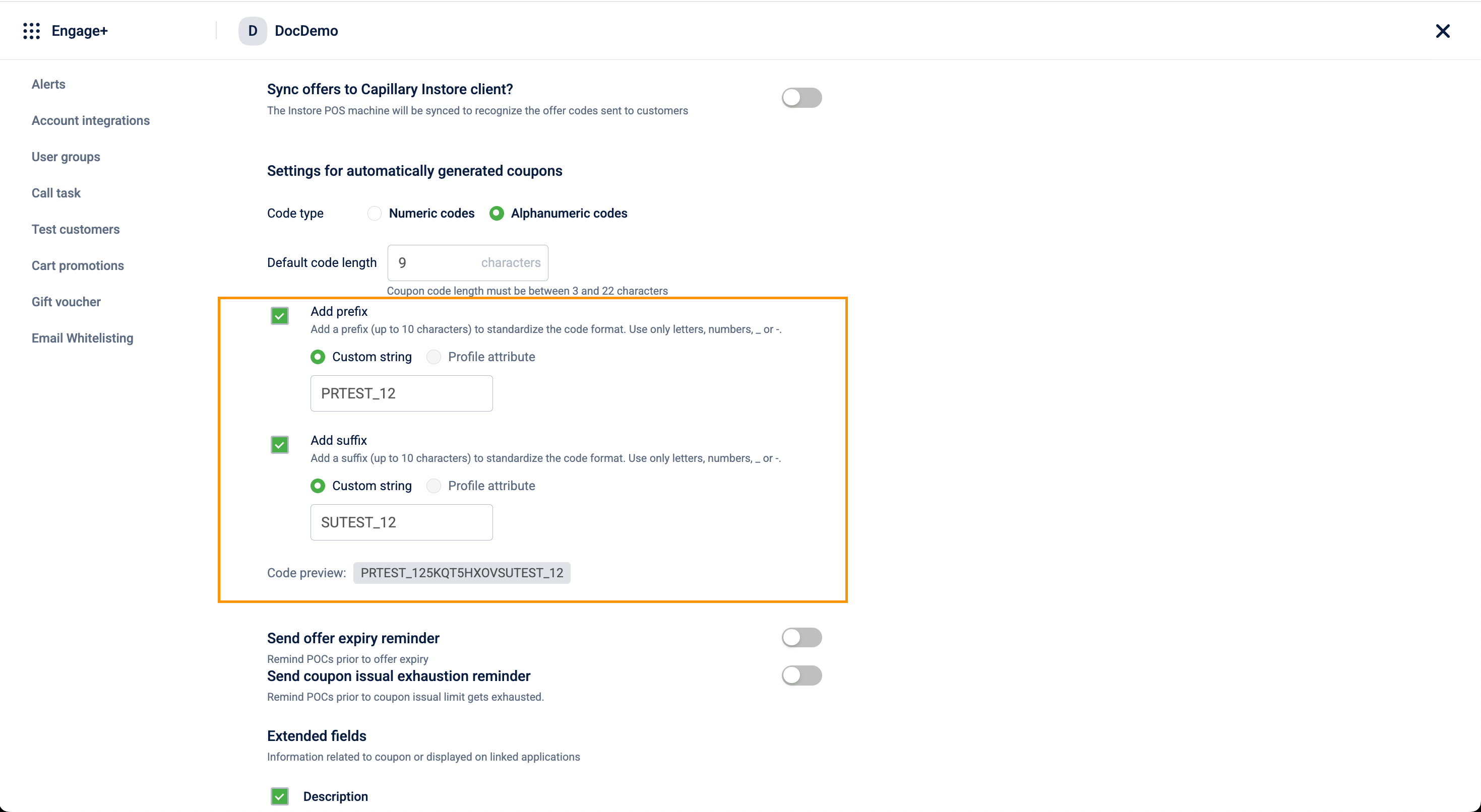 For auto-generated coupon codes, you can set the coupon code length, type, and the information regarding the offer.