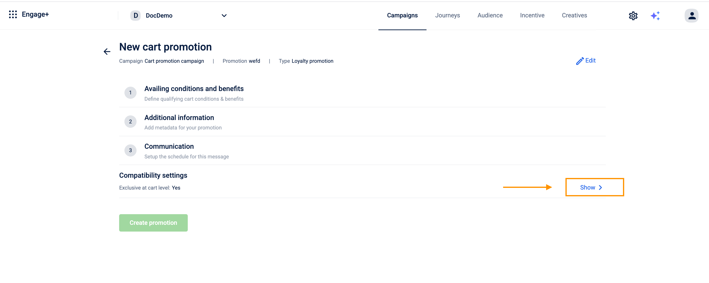 - Toggle "Mark this promotion as exclusive at cart level" to make the promotion exclusive at the cart level.