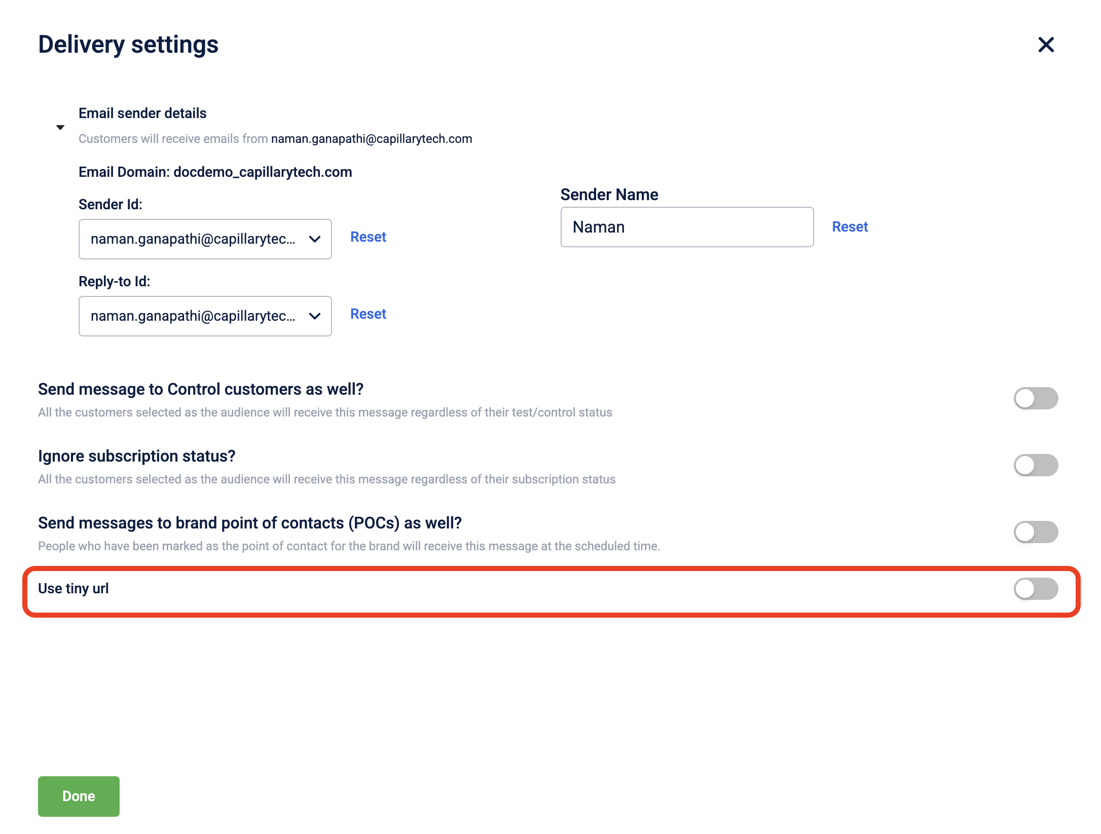 This helps you shorten any URL in your communication message when you are constrained by character limits. You can enable Use tiny URL from the delivery settings, and the system will automatically shorten the URL. This is applicable across all engagement channels.