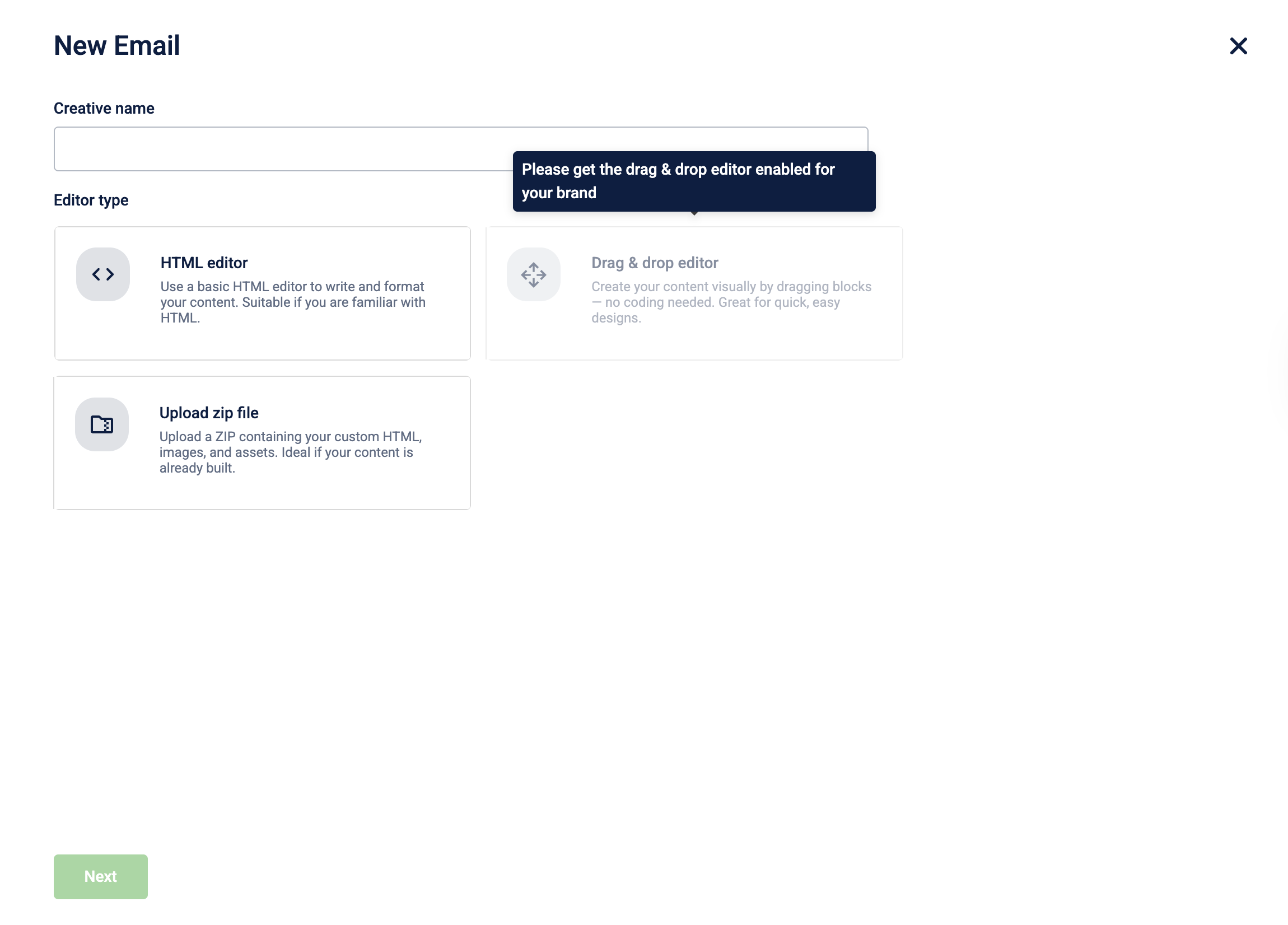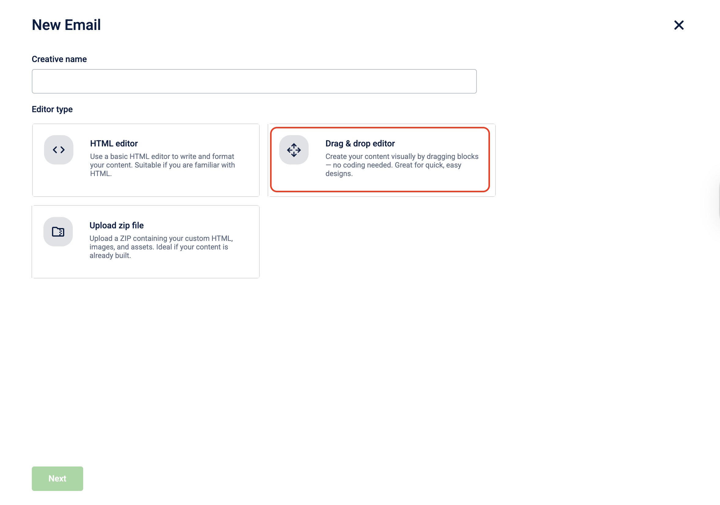 Enter a Creative name for the email template and select HTML Editor as the creation mode.