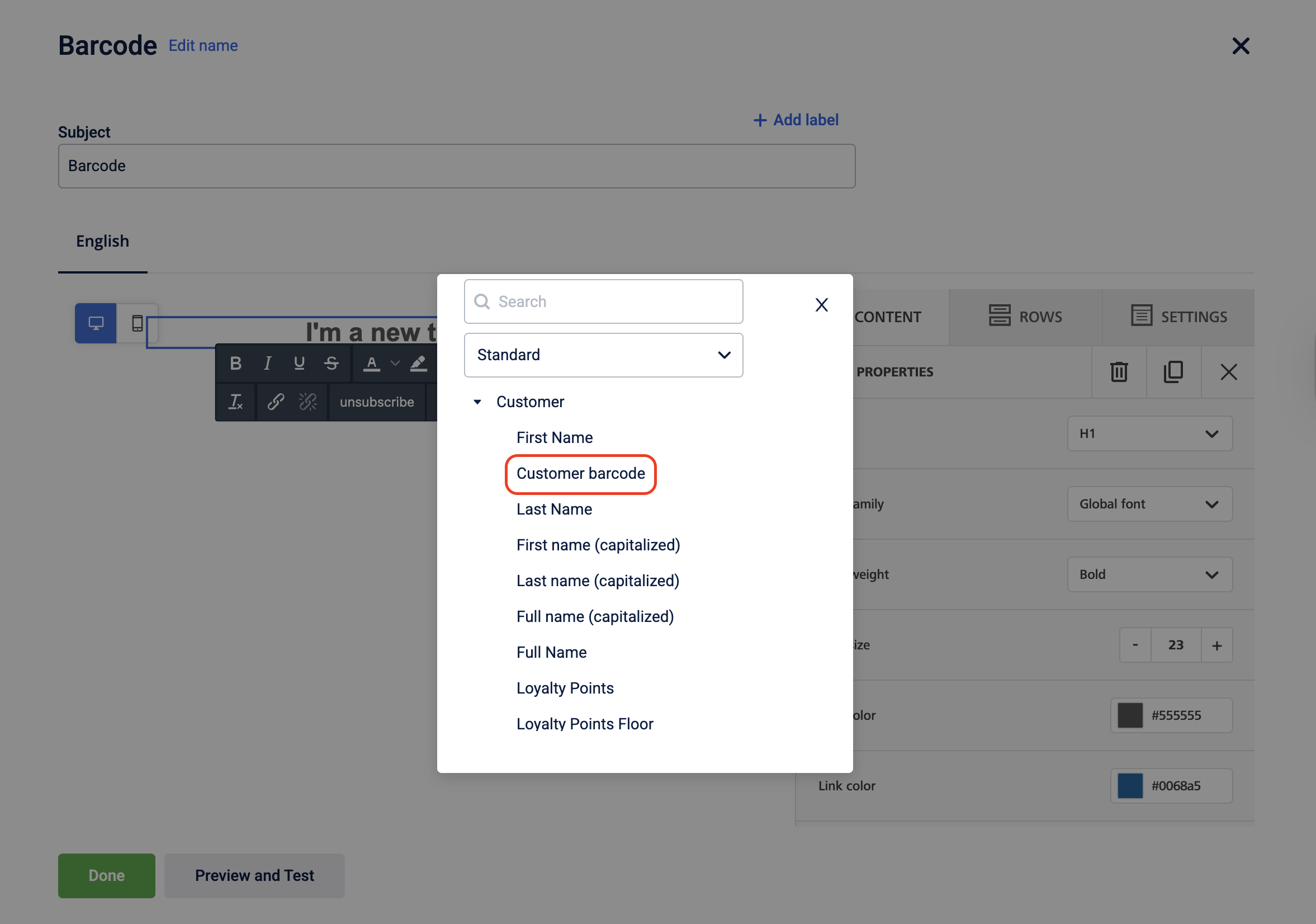 Select Preview and Test to populate values for any tags and labels, review the rendered content, and send test messages to test customers before sending the email.