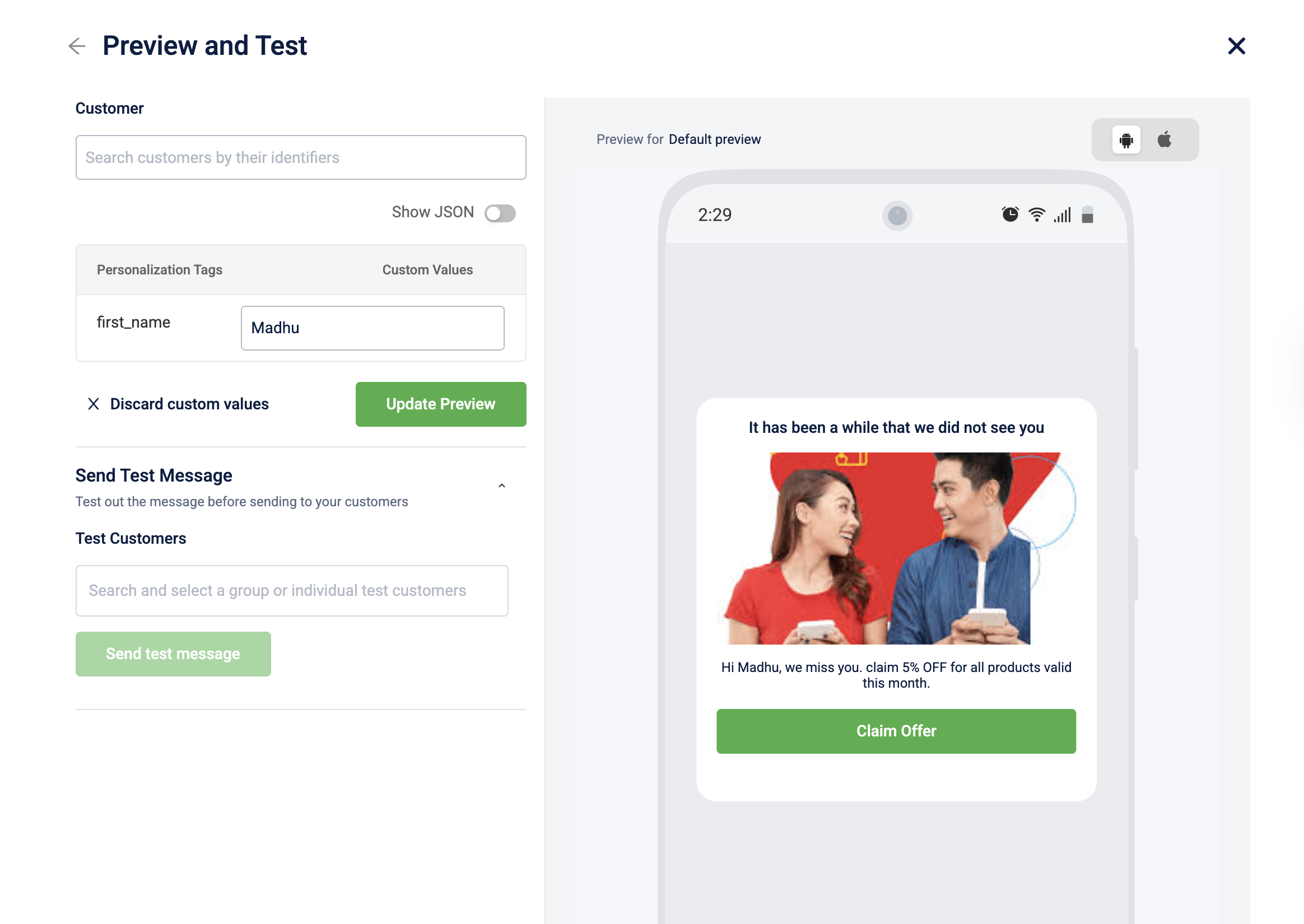 - Select Preview and Test to preview the message content and test it with a set of test customers before sending it.