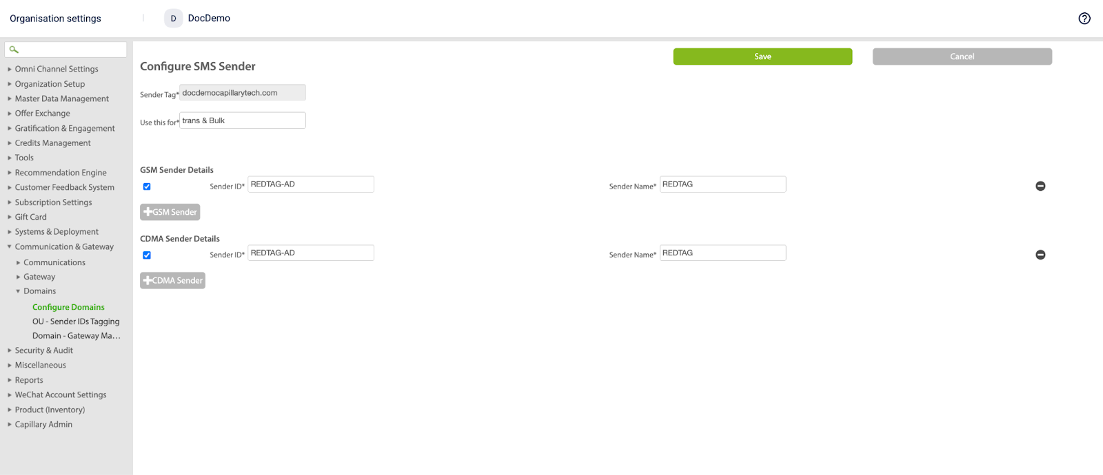 | GSM Sender Name | An alphanumeric name used inside the system to identify the GSM Sender ID. This is not shown to recipients. For example - BANKXYZ |