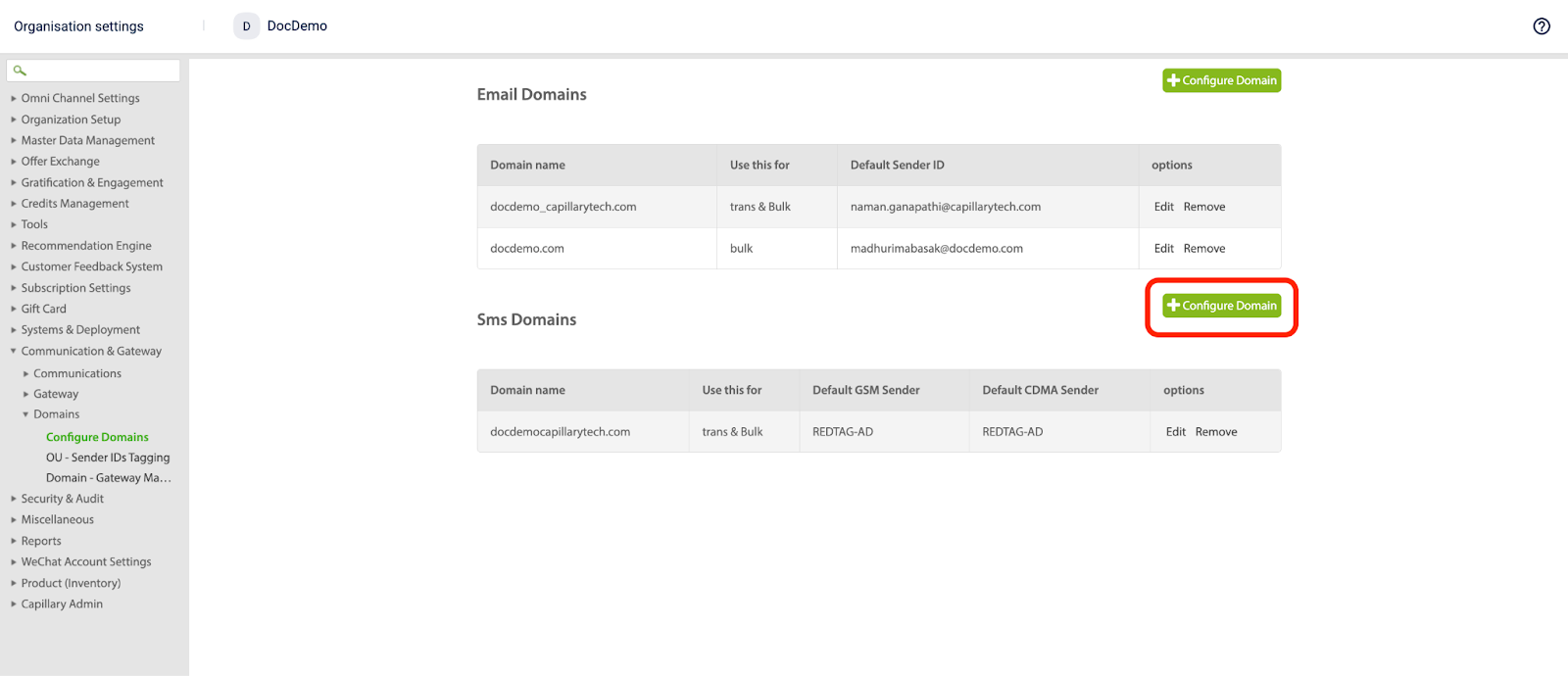 - In the Brand organization, navigate to: Organization Settings > Communication & Gateway > Domains > Configure Domains.