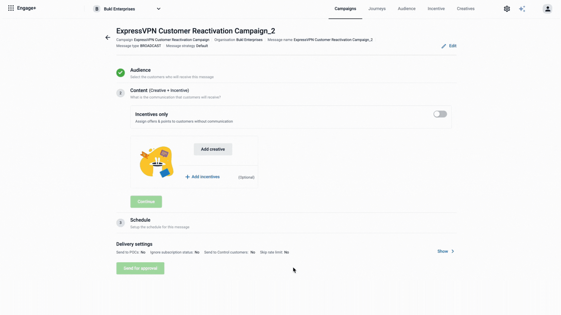 - In the Content section, select Add Creative and choose WhatsApp as the engagement channel and select the desired template from the list.