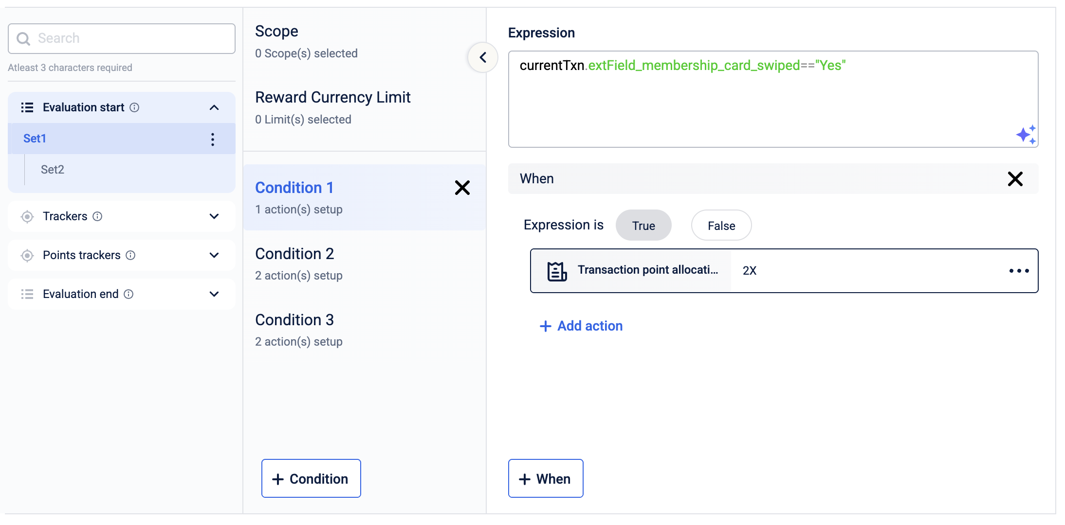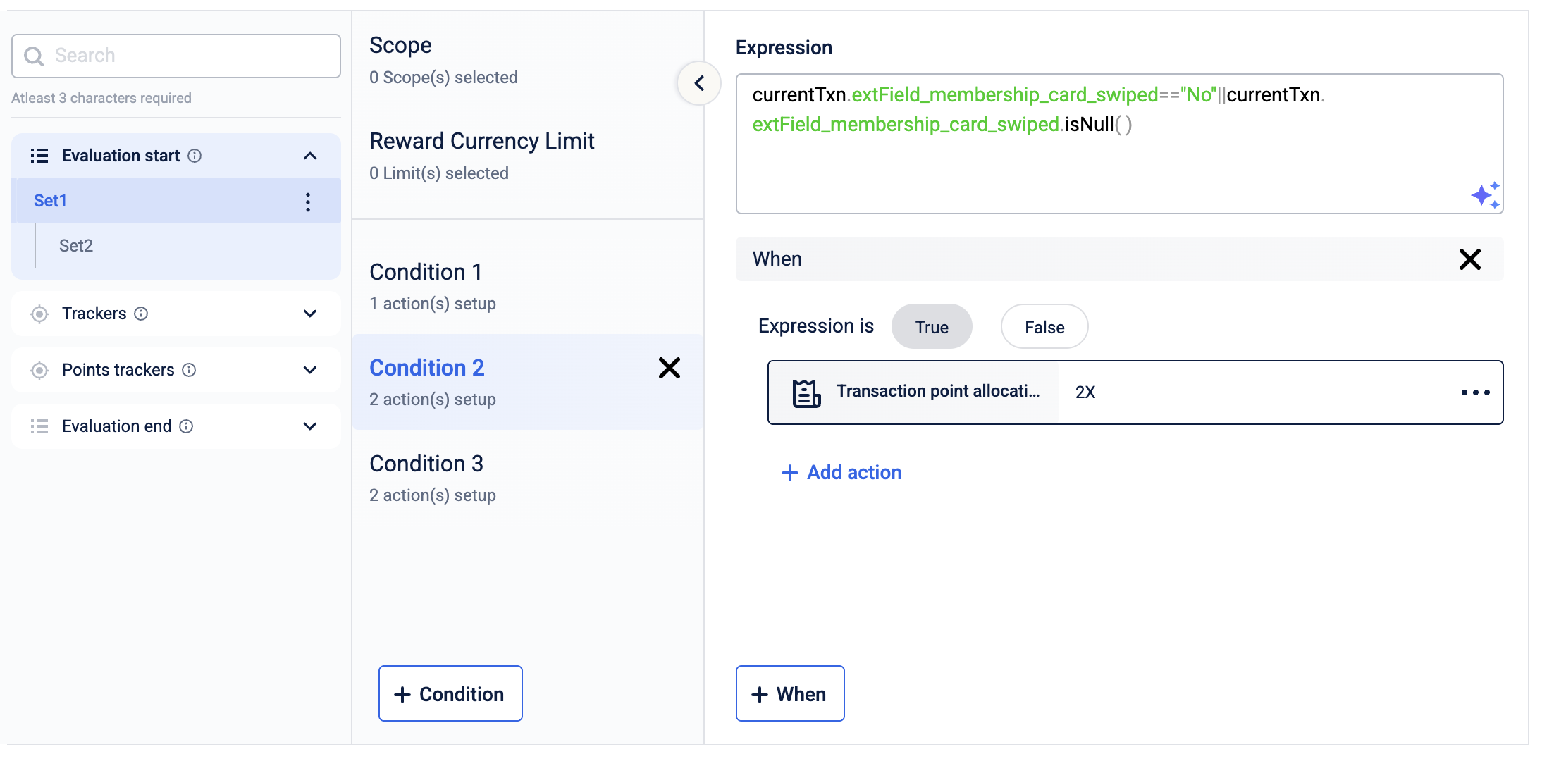 In the above expression example, membership_card_swiped is the extended field enabled for identifying user group related transactions.