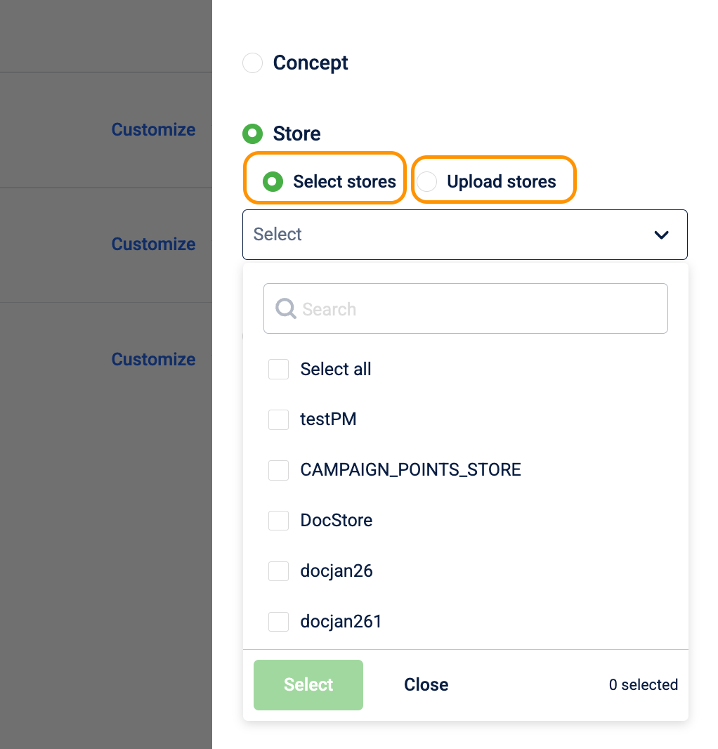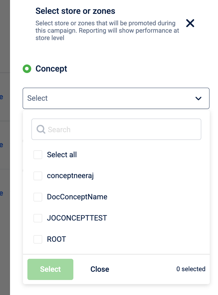 Specify where the promotion should run by limiting it to specific store entities: Concepts, Stores, or Zones. so only customers transacting in those selected entities are eligible for the offer.
