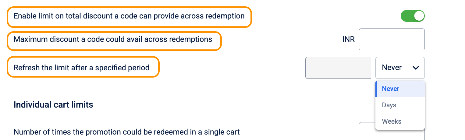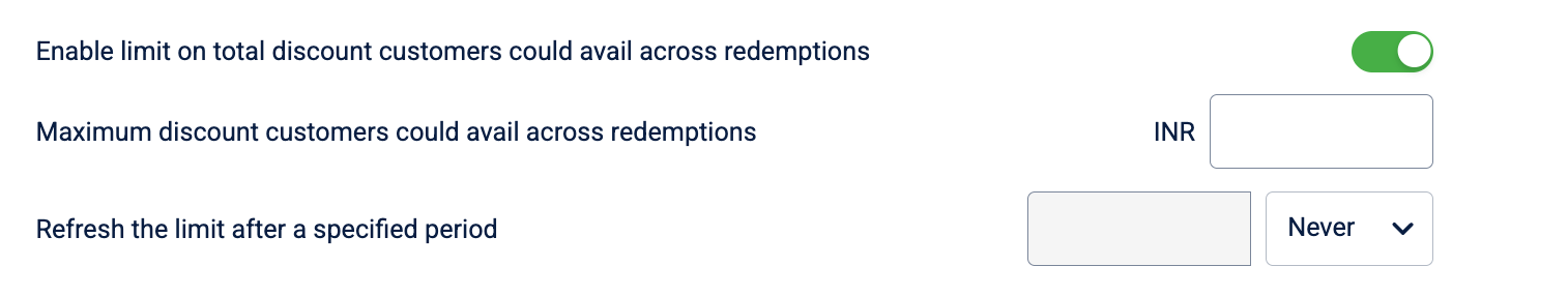 - Enter the Maximum discount customers could avail across redemptions in INR.