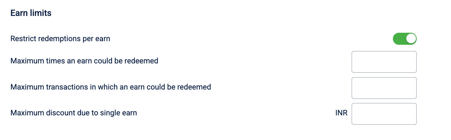 You can use earn limits to control how many times each earned benefit can be redeemed and how much discount a single earn can give.