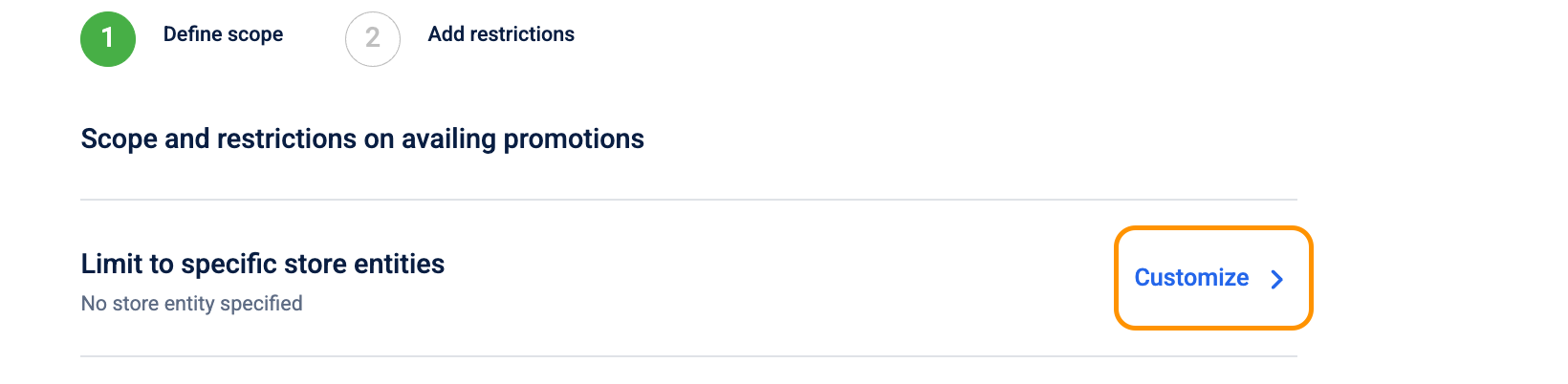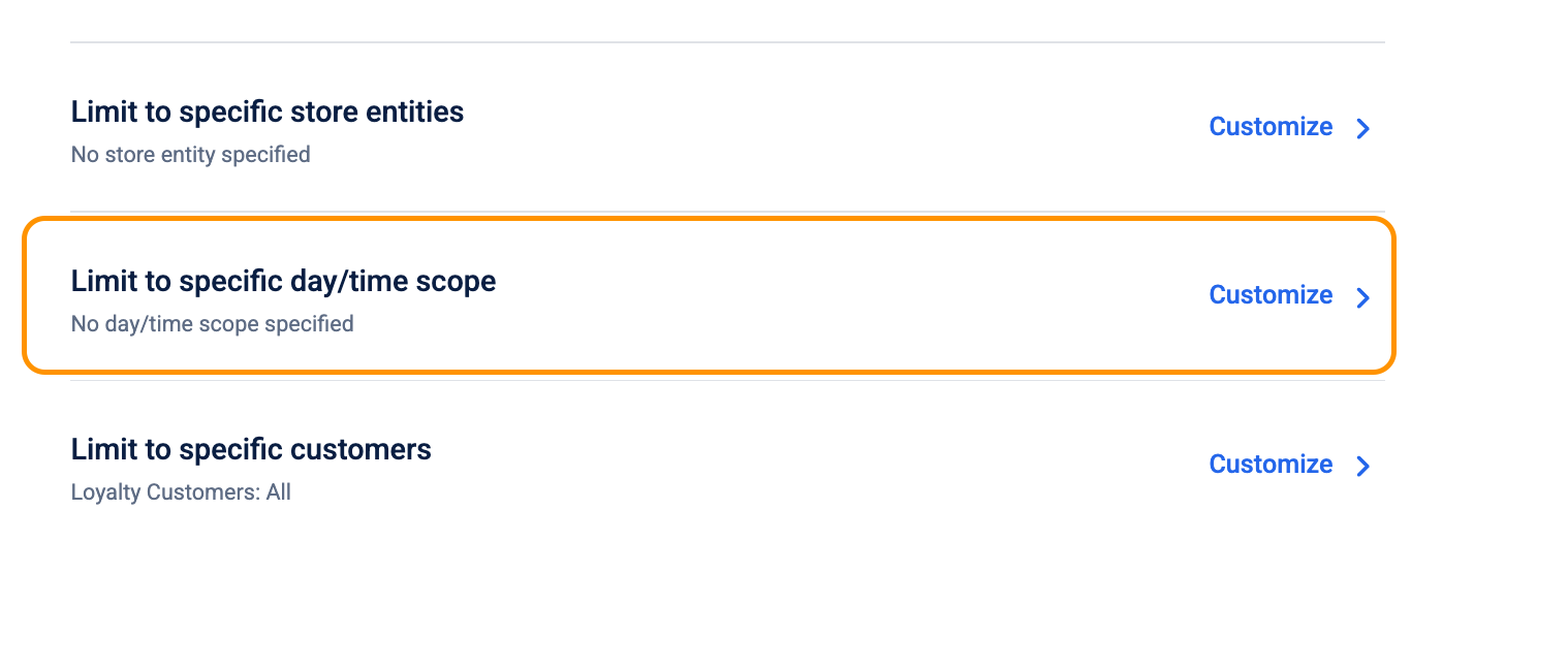 You can specify restrictions to control how often a promotion can be used and how much discount it can give. Here you can set limits per earn, per cart, per customer, and across all customers, and these settings can’t be changed after the promotion goes live.