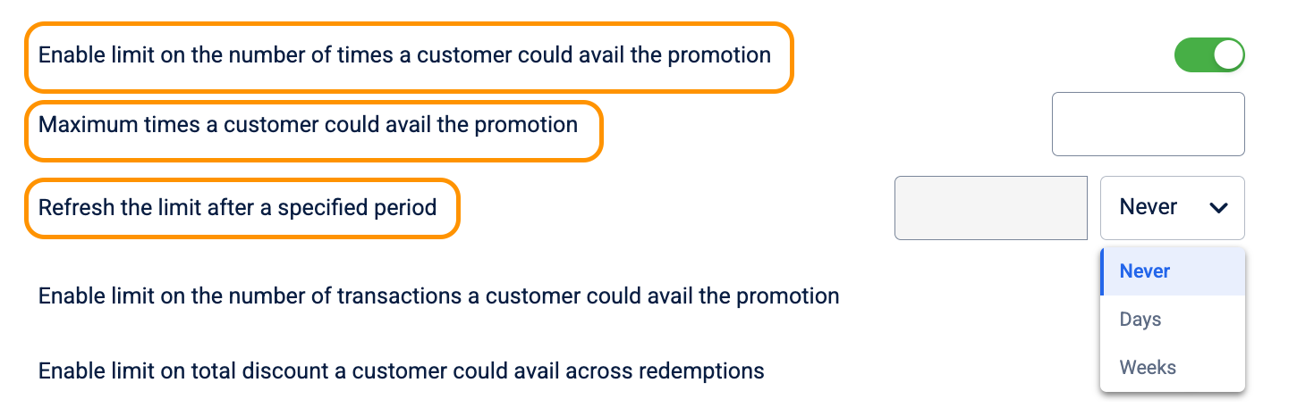 - Under Refresh the limit after a specified period, enter the value and select the frequency. This allows you to create a "Per-Visit" promotion. For example, setting a limit of 1 transaction every 1 week encourages the customer to return to your store once a week to use their reward.