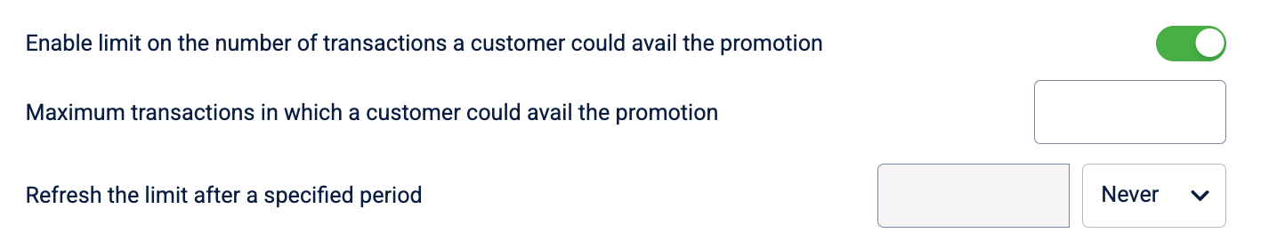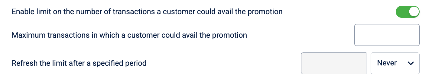 Toggle Enable limit on the number of transactions in which customers could avail the promotion