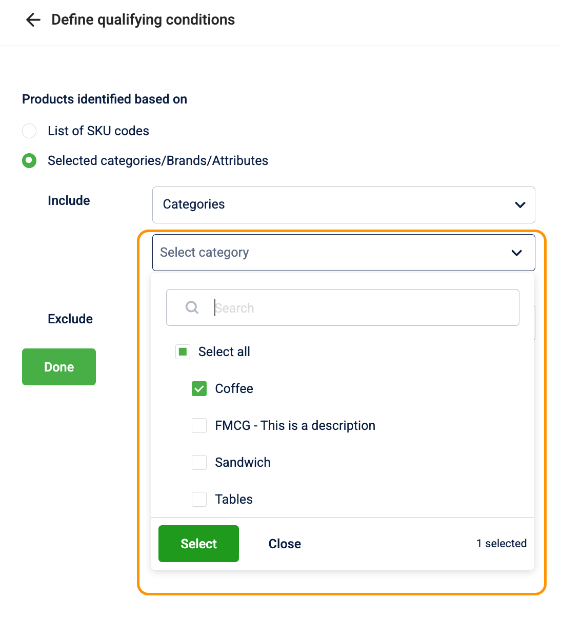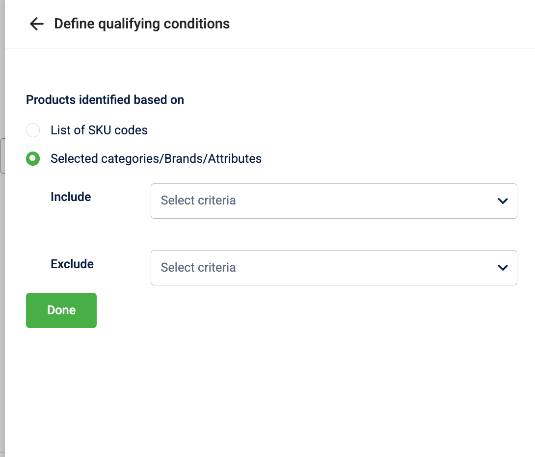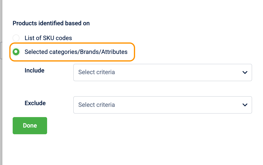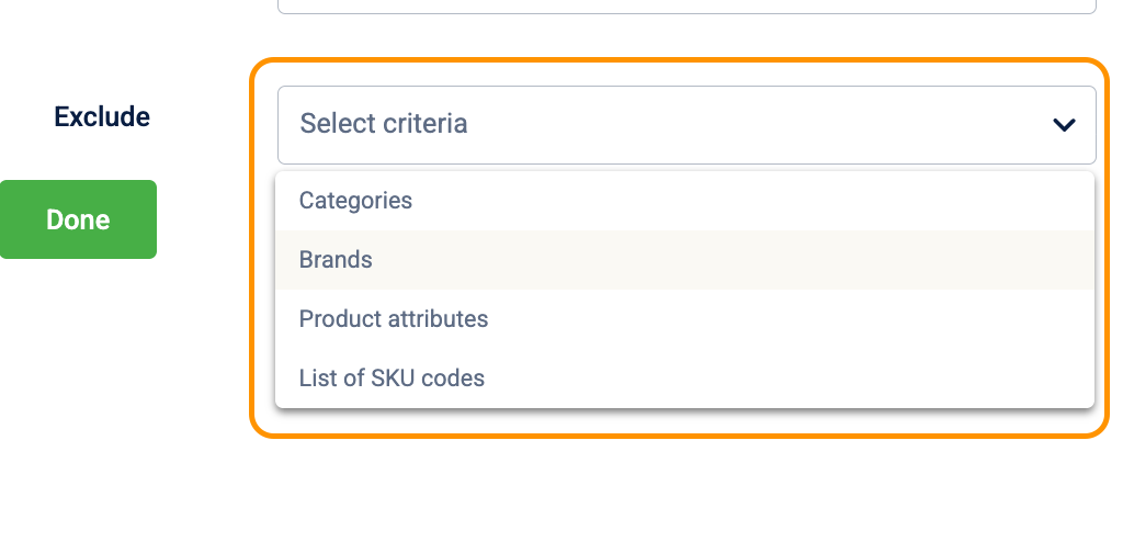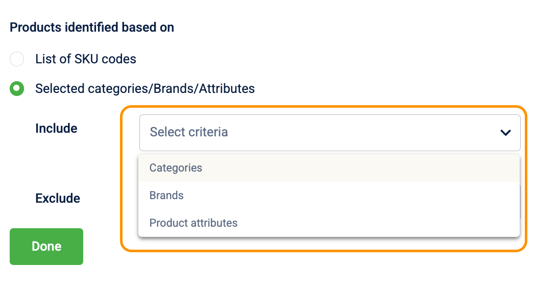 - You can exclude items based on Categories, Brands, Product attributes, or by uploading a specific List of SKU codes.