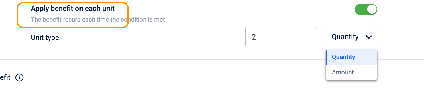 Once the qualifying conditions are met, you must define the specific benefit the customer will receive. This involves determining whether the discount applies to the entire cart or specific items, and choosing the calculation method for the benefit.