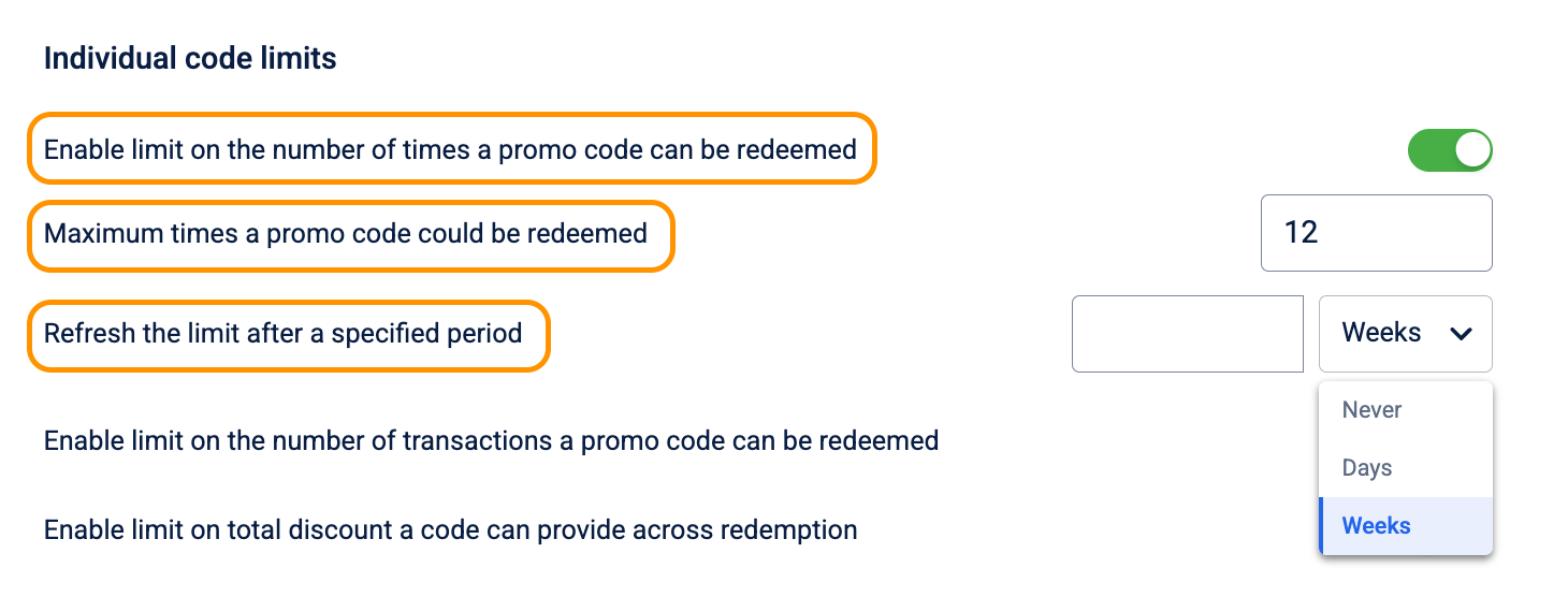 ii. Toggle Enable limit on the number of transactions a promo code can be redeemed to Enabled.
