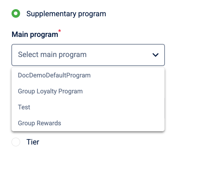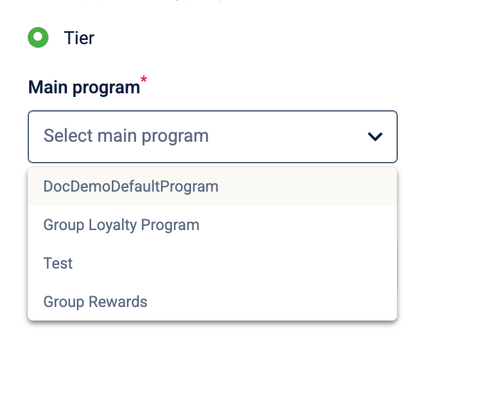 - Select Main program: Navigate to the Main program dropdown and select the primary loyalty program associated with the subscription.