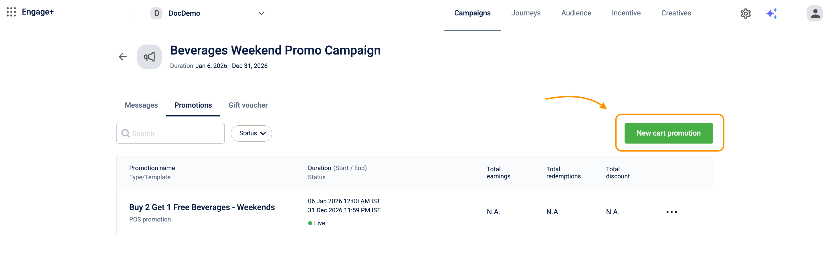 Go to Engage+, open the campaign where you want to create the promotion, and navigate to the Promotions tab.