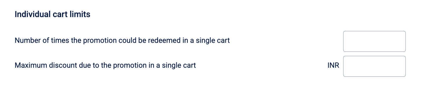 - Maximum discount due to the promotion in a single cart: Enter the INR value to limit the discount per order. Even if a customer qualifies for a high percentage discount (e.g., 50% off), this setting ensures that the total discount amount for that specific order never exceeds your defined amount limit.