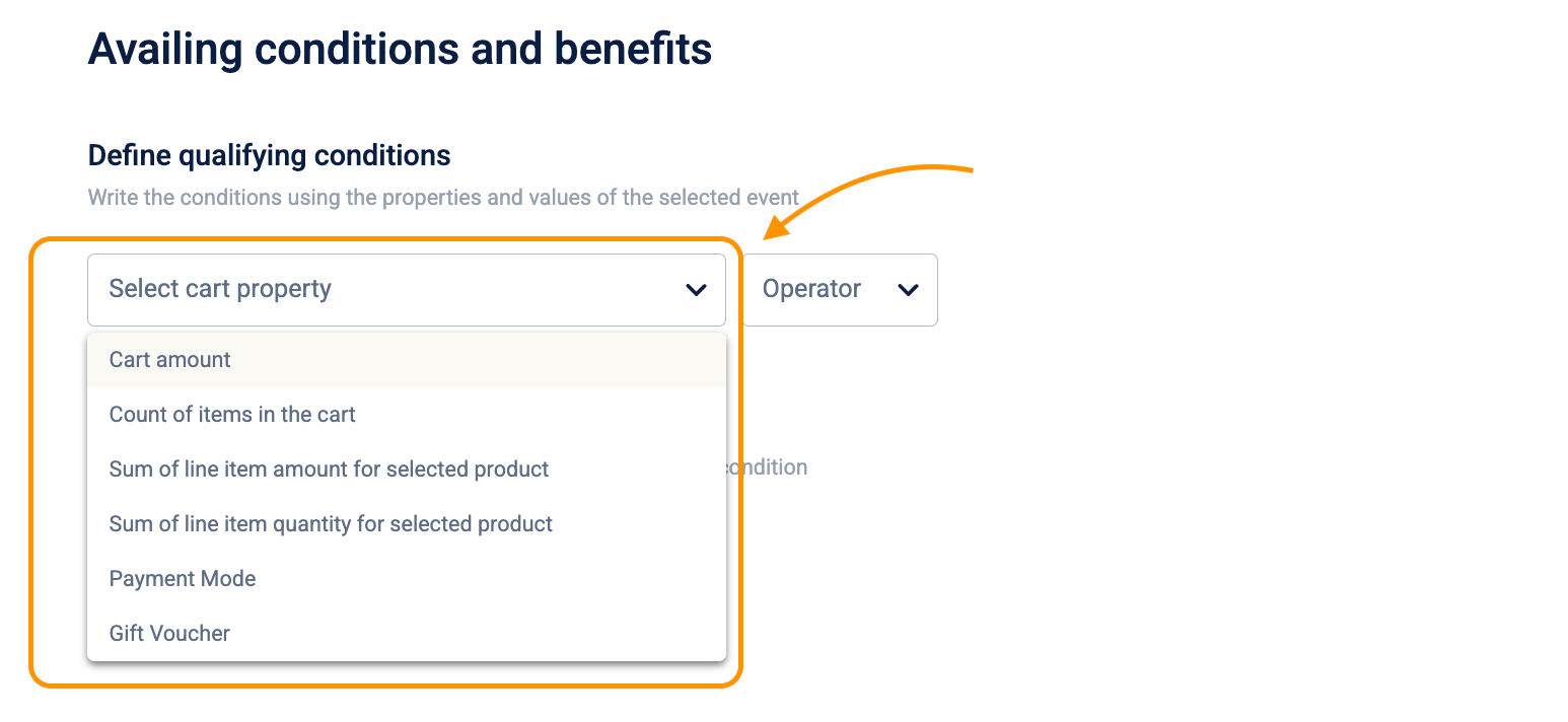 Here, you can specify the cart rules, such as cart amount, item counts, product-level sums, payment modes, or gift vouchers, that can be configured as earning criteria for the promotion's benefit to be applied.