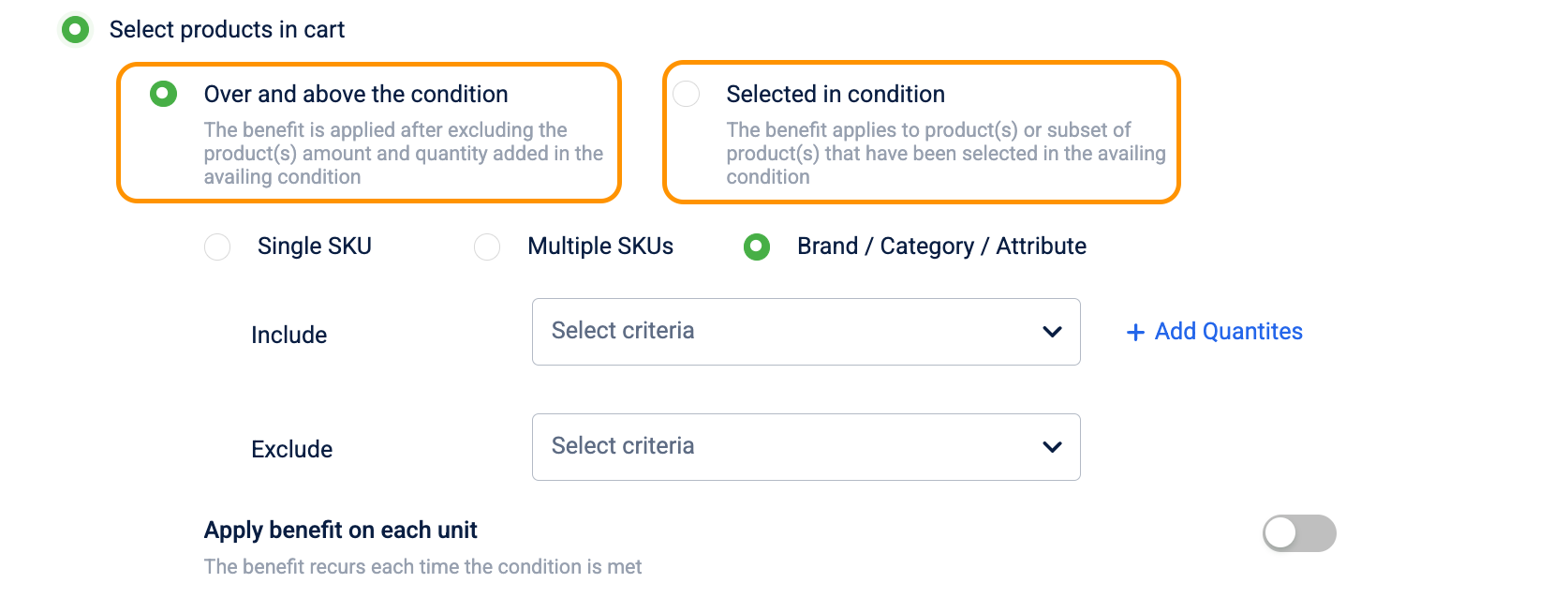 | Over and above the condition | The discount applies to items excluding those that triggered the condition. | Buy X, Get Y: Buy a Laptop (Condition), get a Mouse (Benefit) for free. |