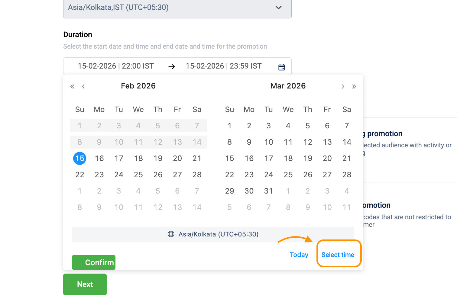 You can select specific hours for the promotion by selecting the Time box at the bottom of the date picker.