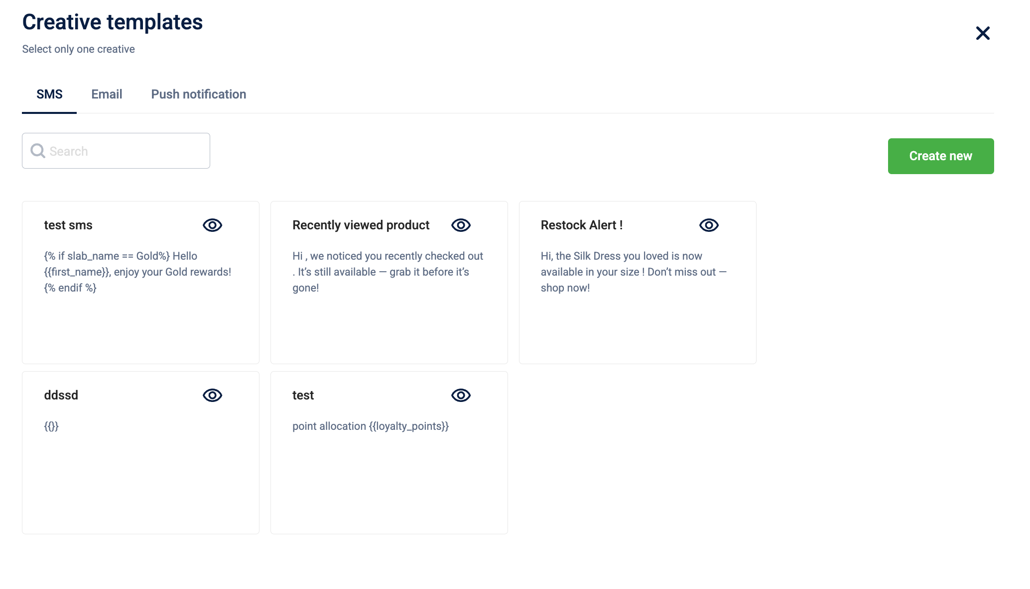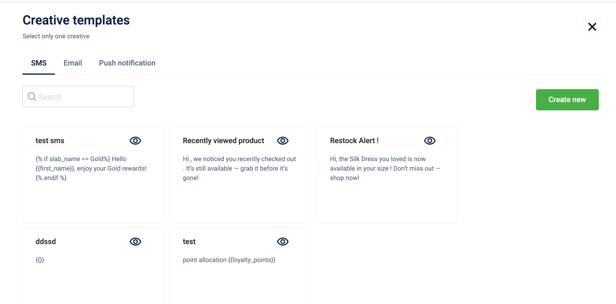 Action: Choose a pre-defined template from the SMS, Email, or Push notification tabs to notify customers the moment they qualify for the benefit.