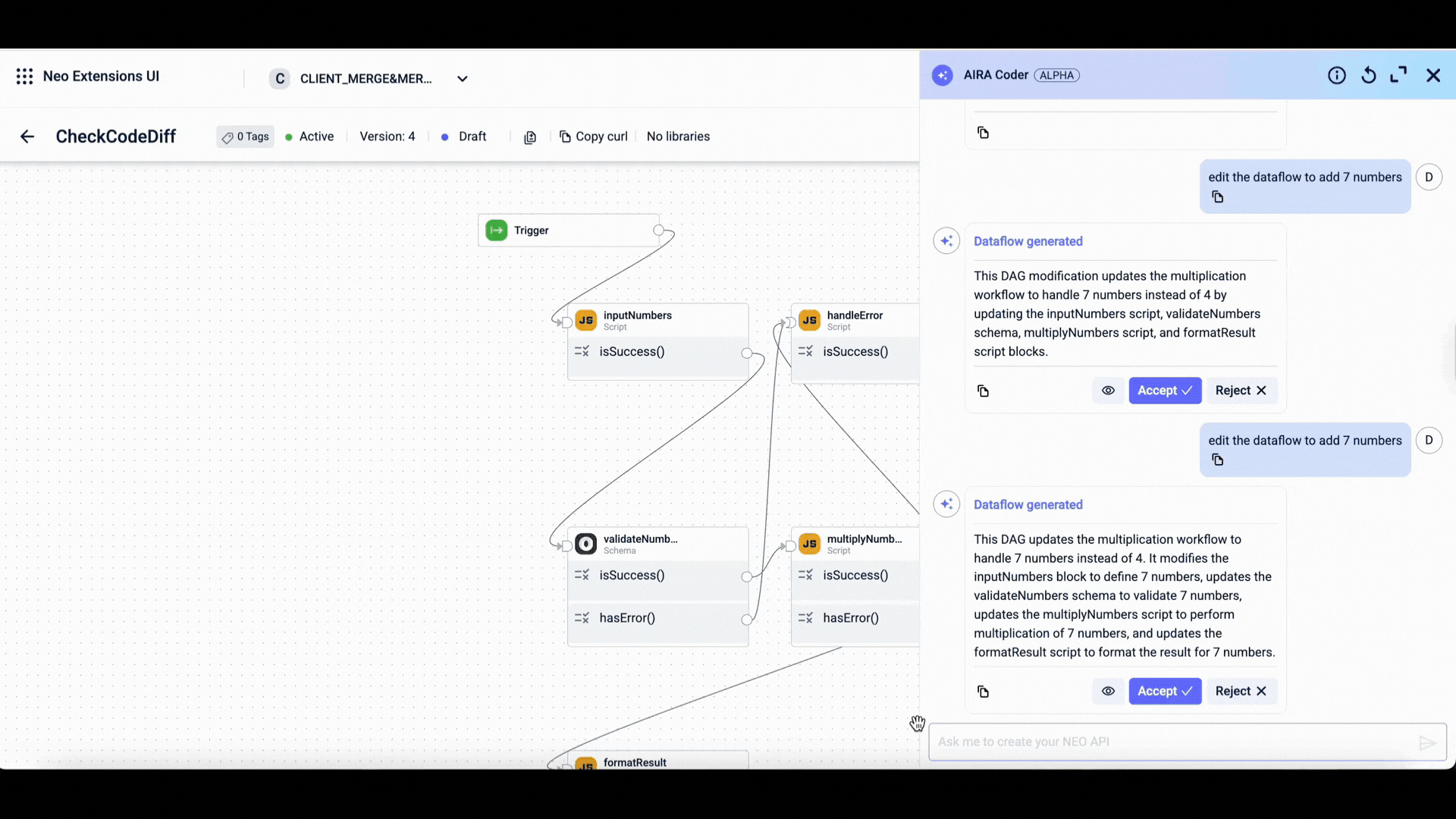 With Neo Extensions, you can now generate dataflows using natural language prompts through the built-in AI assistant—AIRA. This simplifies the workflow creation process, reducing manual effort and speeding up development. The following are the steps to create a dataflow using Aira coder: