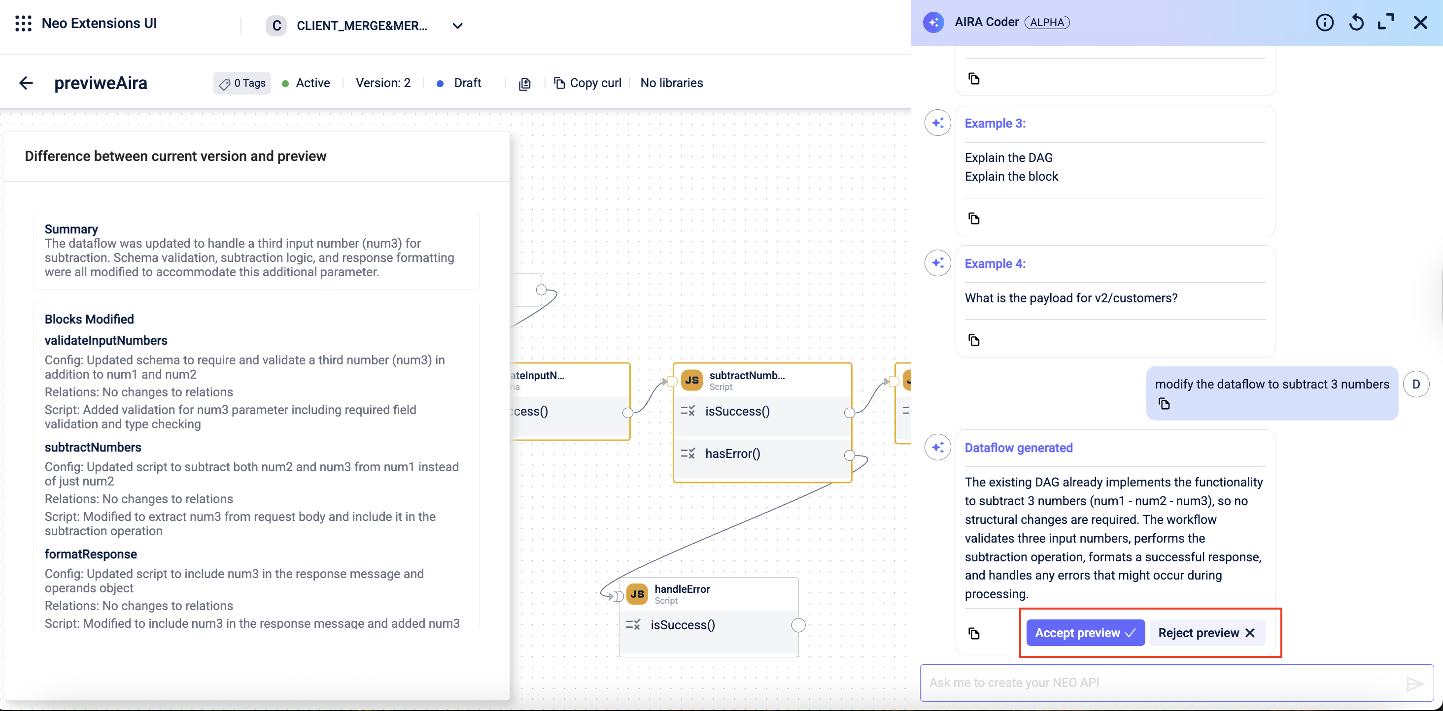 To accept or reject changes, open the AIRA Coder modal by clicking AIRA Coder. In the modal, you can: