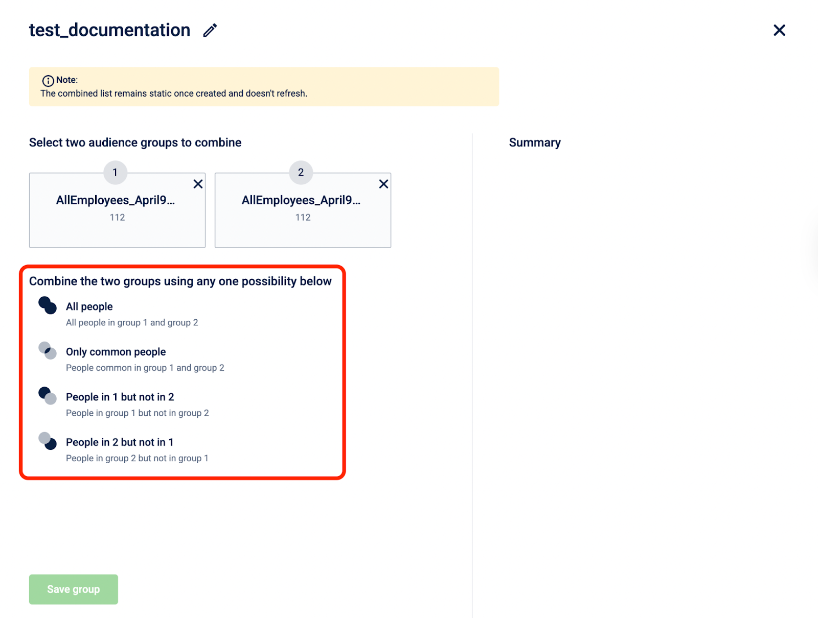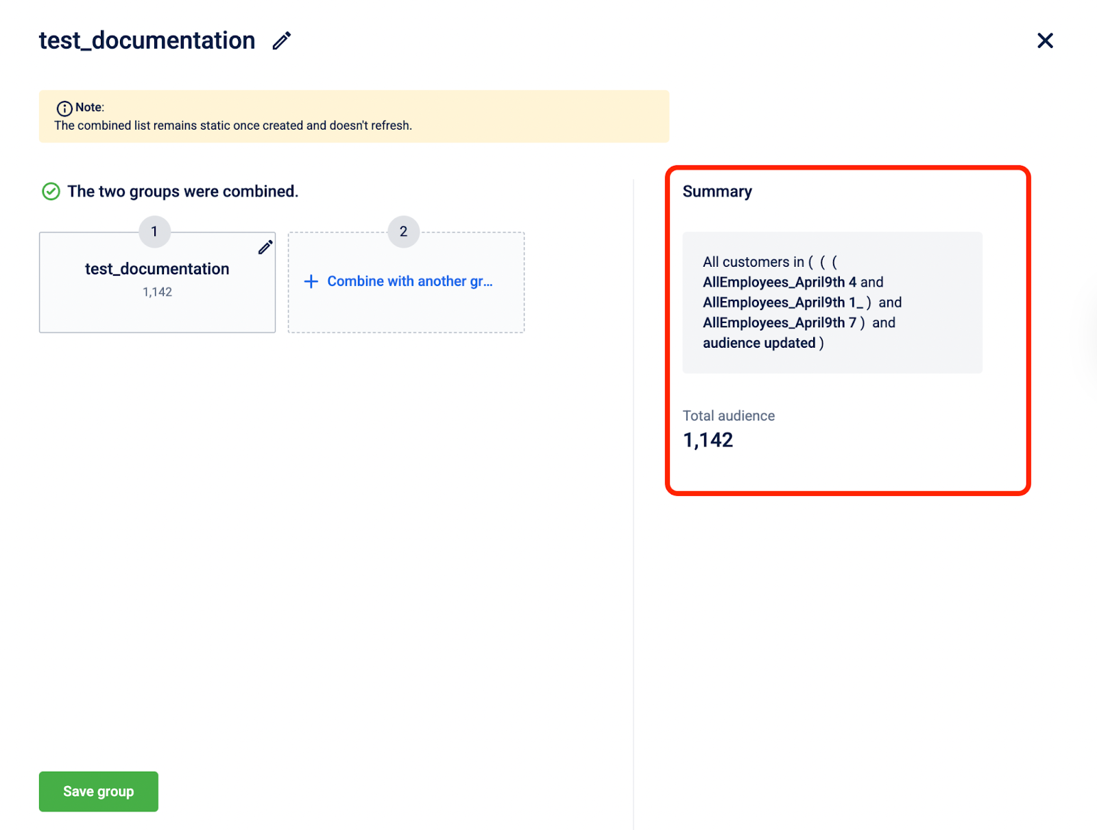 - On the right side of the modal, the Summary section displays the combined audience groups, the combination logic used for each group, and the total audience count after each combination.