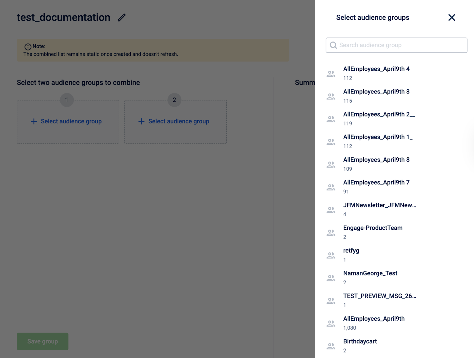 The combined list will appear on the audience page with the title 'combined list' below the audience group name.