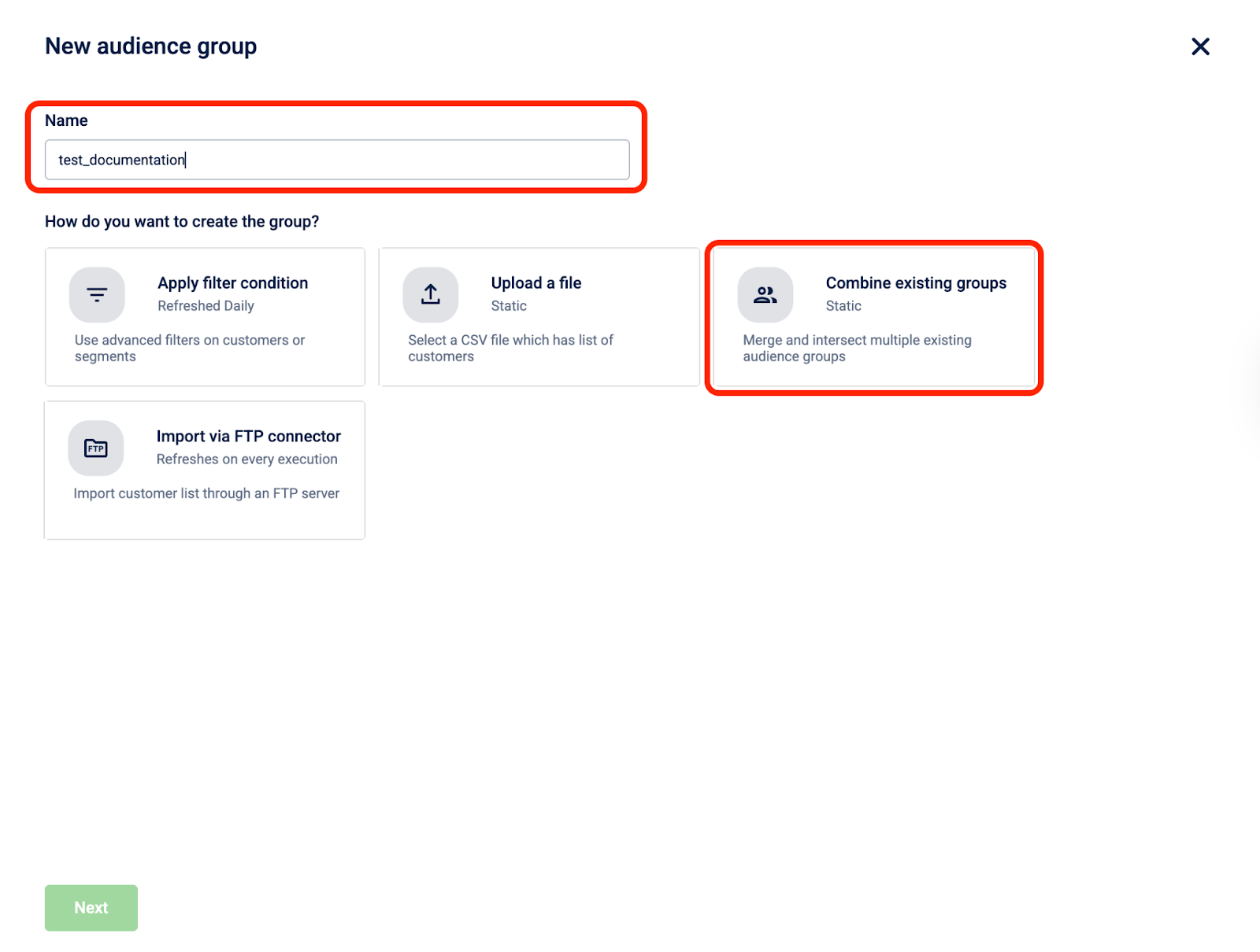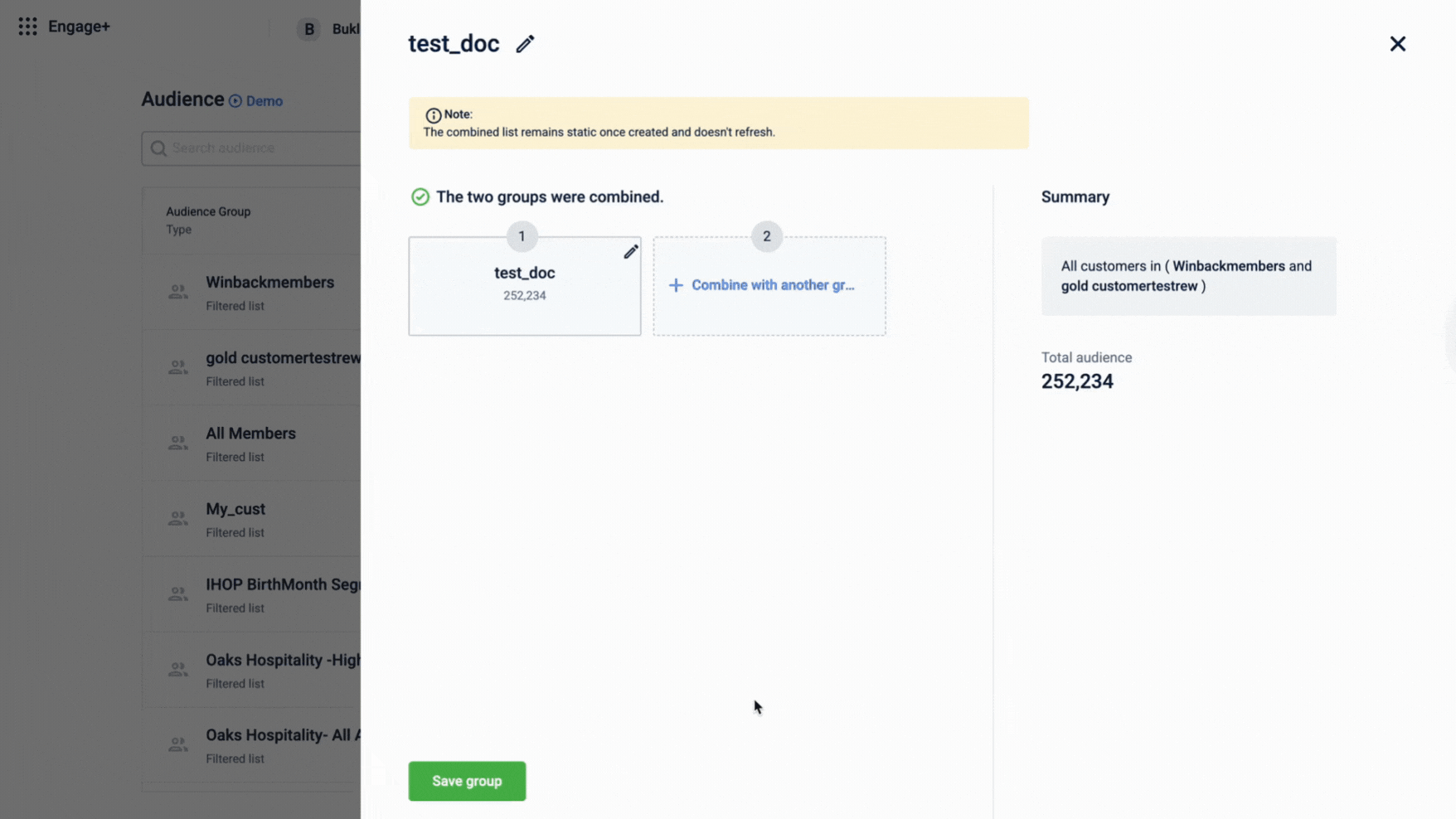 You can create an audience group by combining two existing audience groups. This can be done either from the Audience section or during the message creation flow for a campaign.