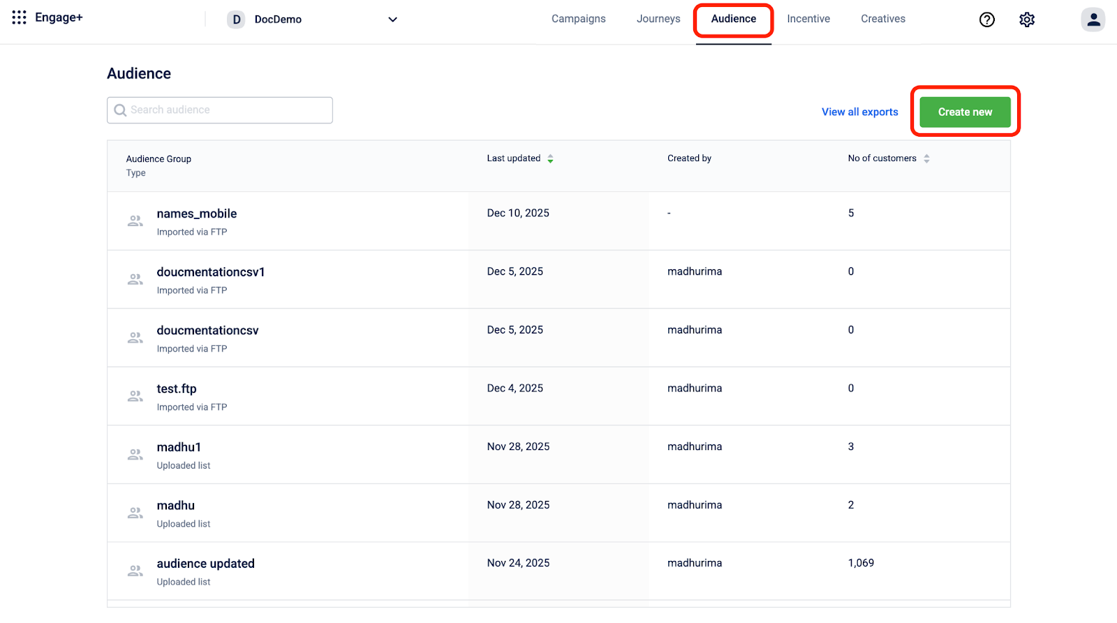 - From the Engage+ homepage, select Audience. On the audience listing page, select Create New to create a new audience group.