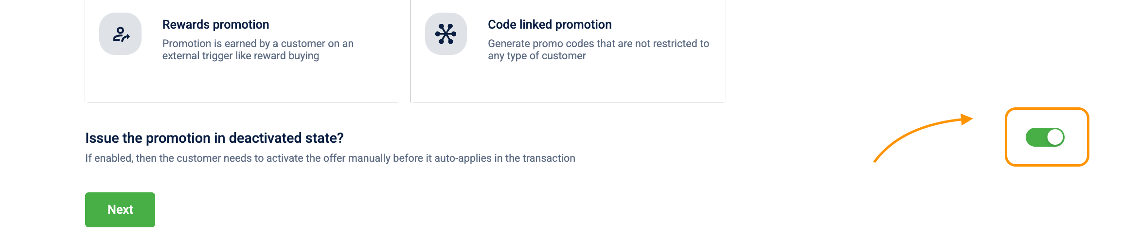 Function: When enabled, the promotion is issued in a "deactivated" state. Customers must manually activate it via the app or website before it can be applied.