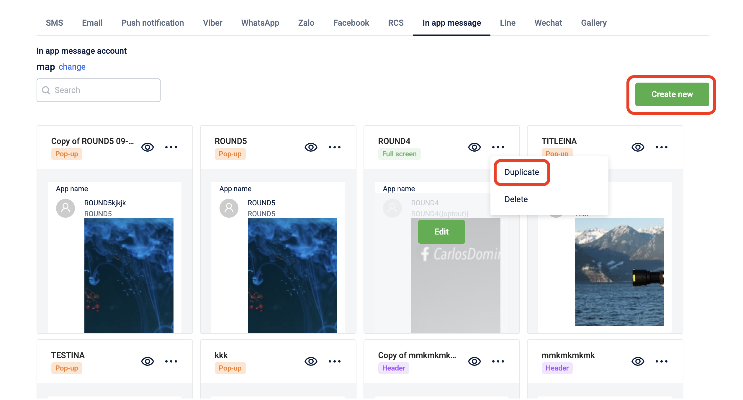 - Click Create New to configure a new message from scratch or Duplicate to modify an existing message.