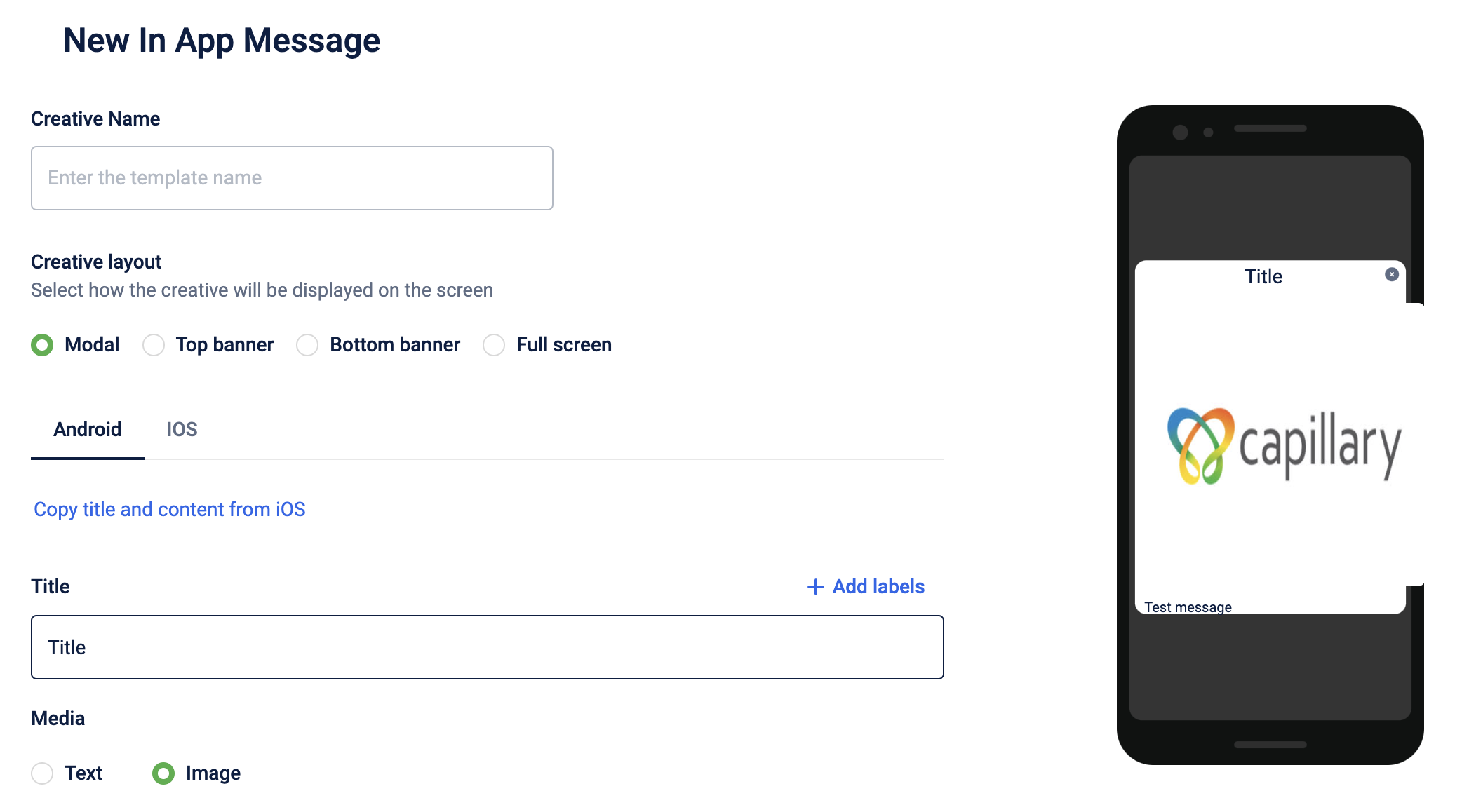 - Select Android or IOS as applicable. After configuring content for any, you can copy the title and content and configure content for the other.