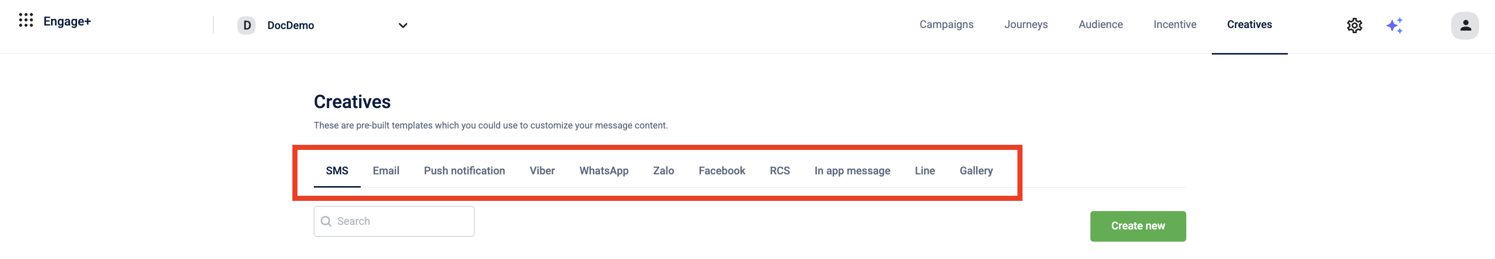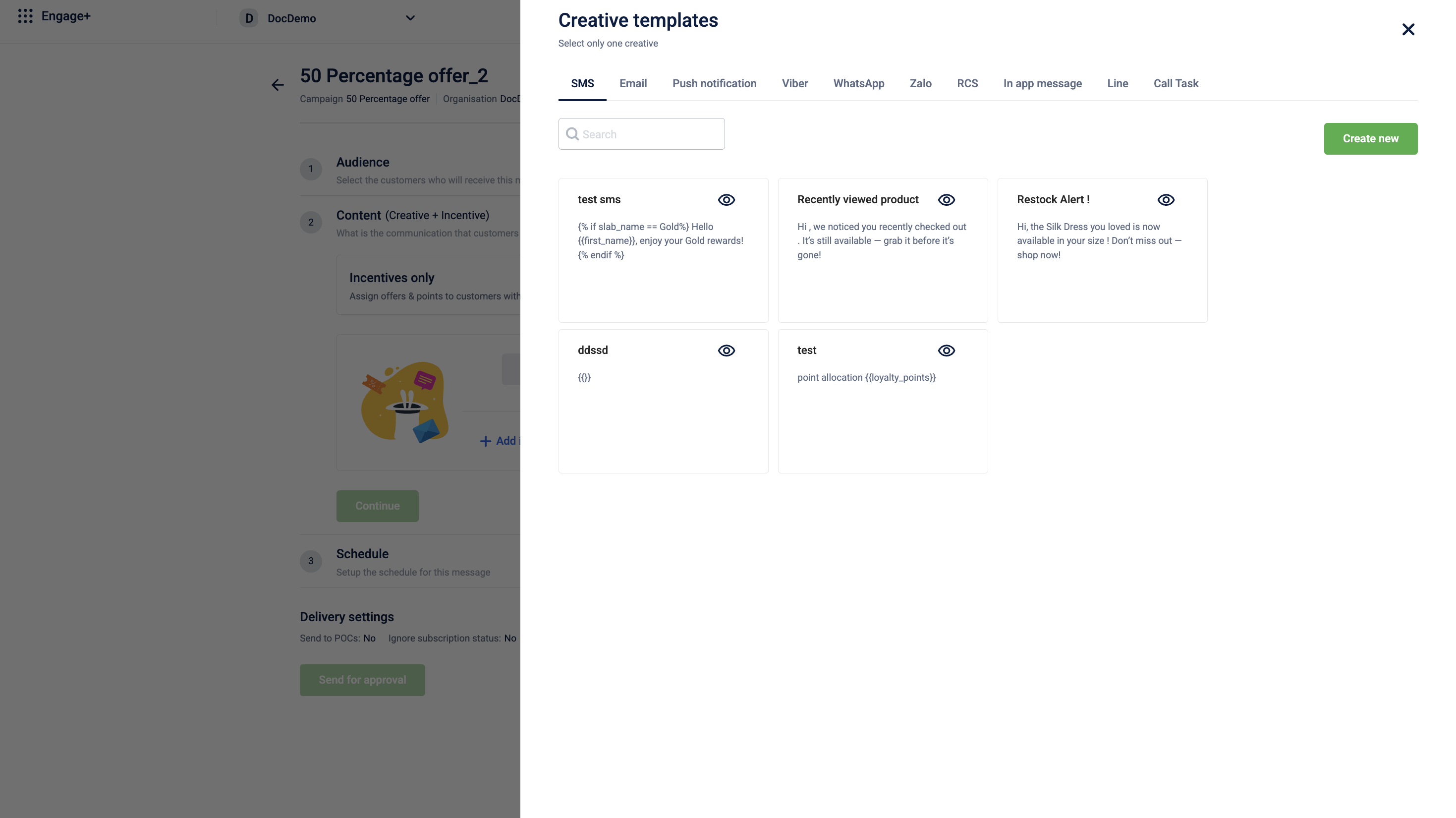 - A modal appears for creative templates where you can select any of the engagement channels.