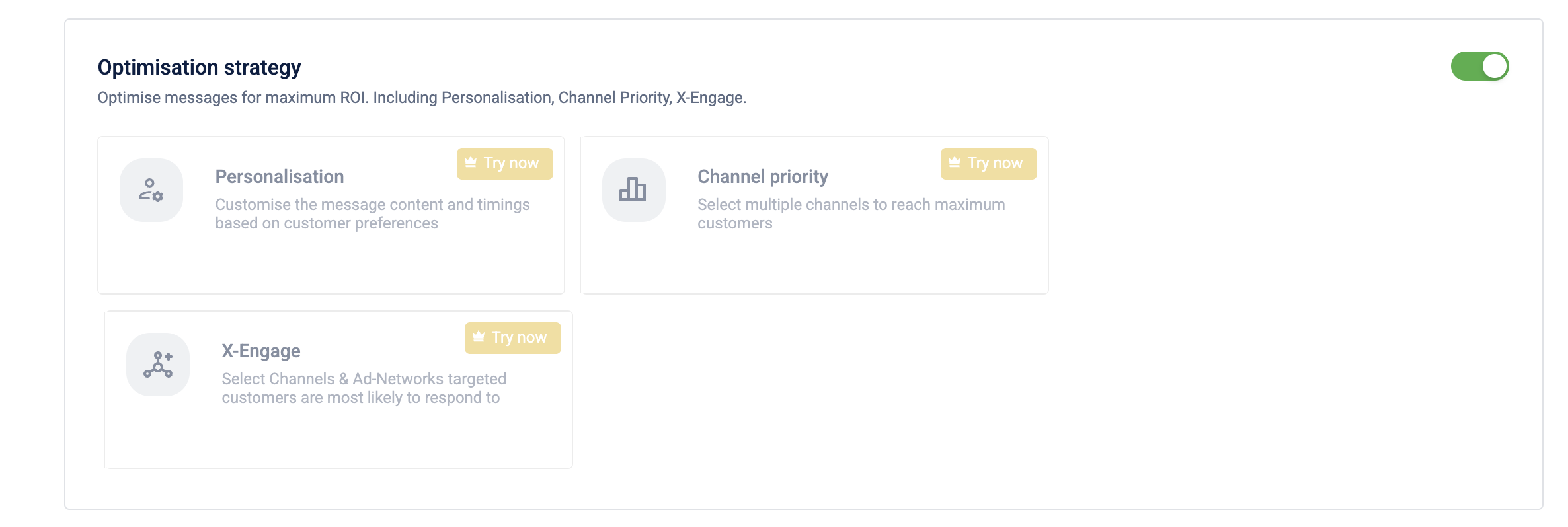 - To enable message personalization, enable the Optimization Strategy toggle button. After you enable it, you can choose one of the available options: Personalization, Channel Priority, or X-Engage.