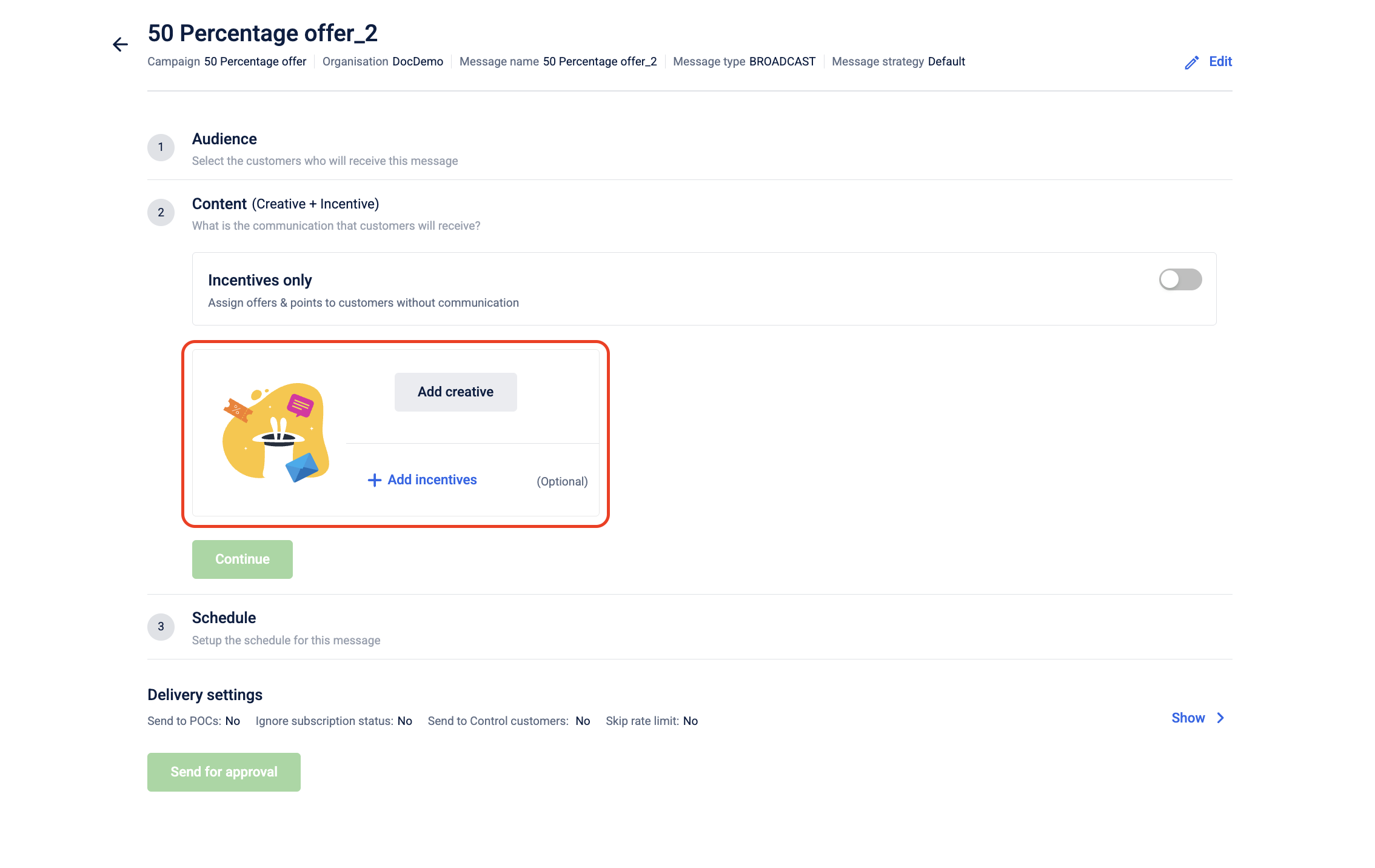NoteYou can add both points strategy and offer in the message content. To add another incentive type, click ADD INCENTIVES and select the other option.