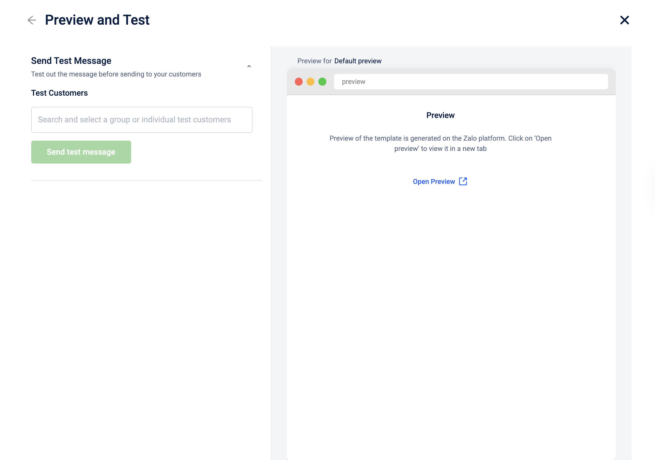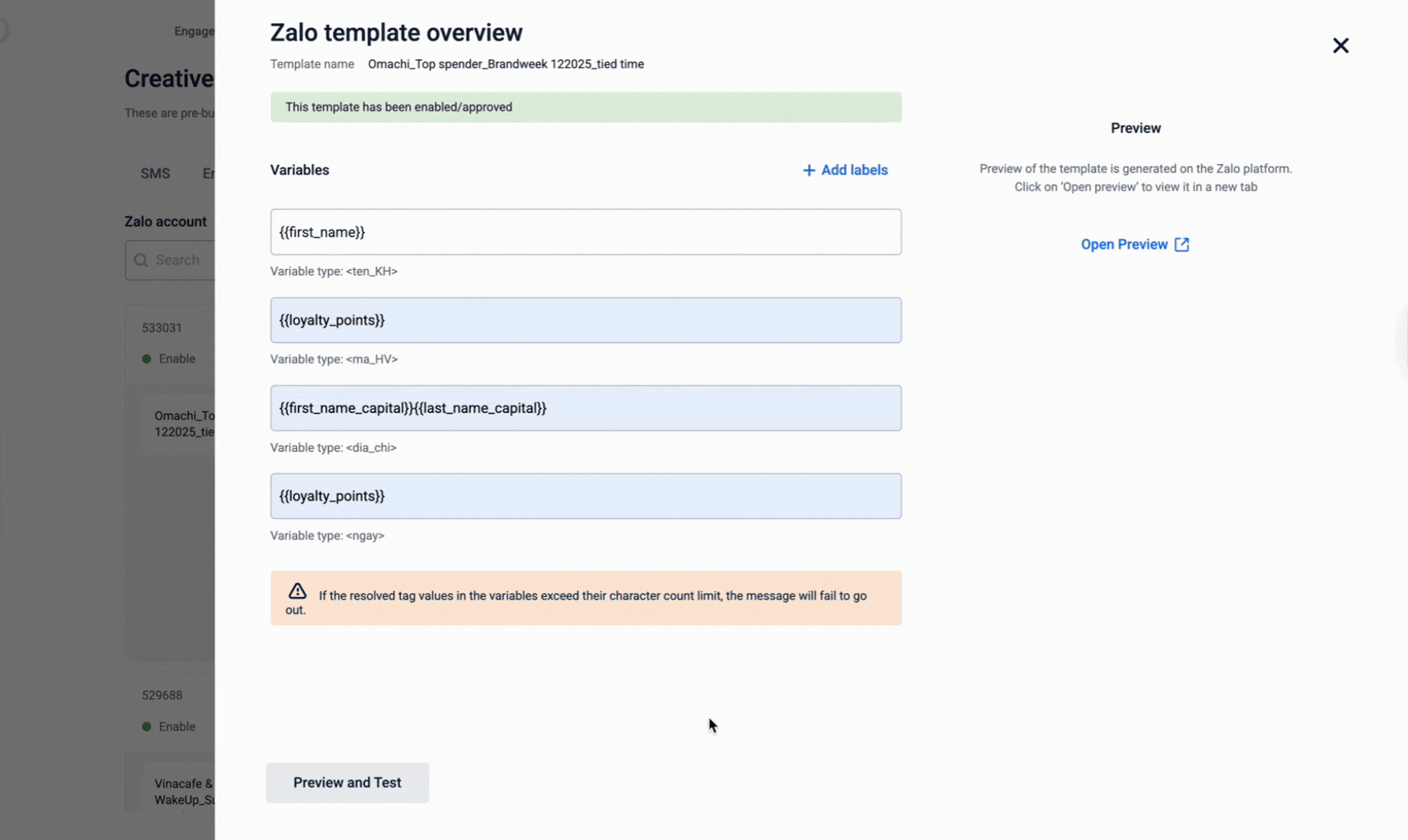 ({#var#})supports a maximum of 50 characters. If a label resolves to more than 50 characters, the message is not sent and is skipped for that user. - On the right side of the modal, select Open Preview. You are redirected to a tab where you can preview the Zalo content.